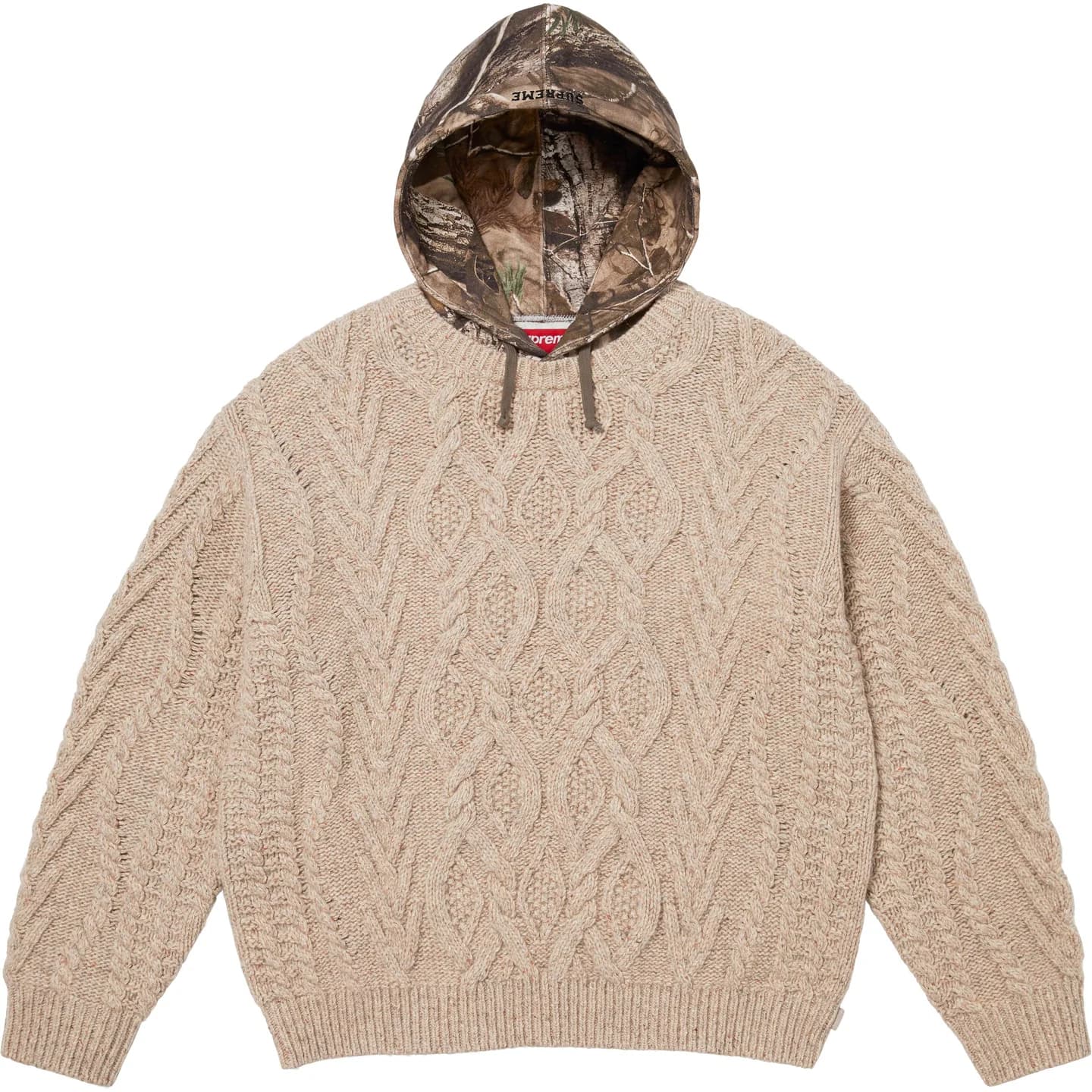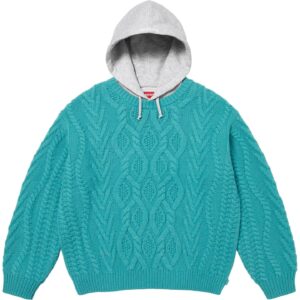ケーブルニットにスウェット素材のフードを組み合わせたウールブレンドセーター。
