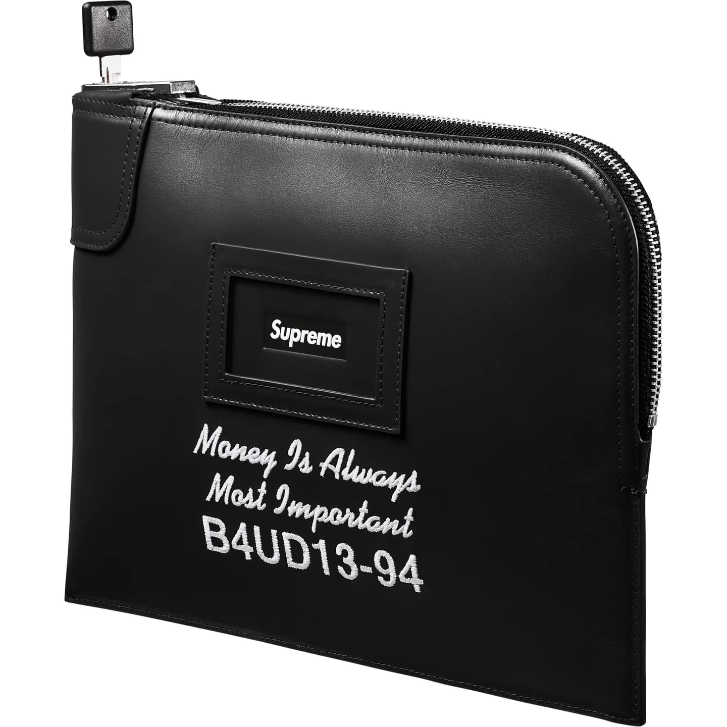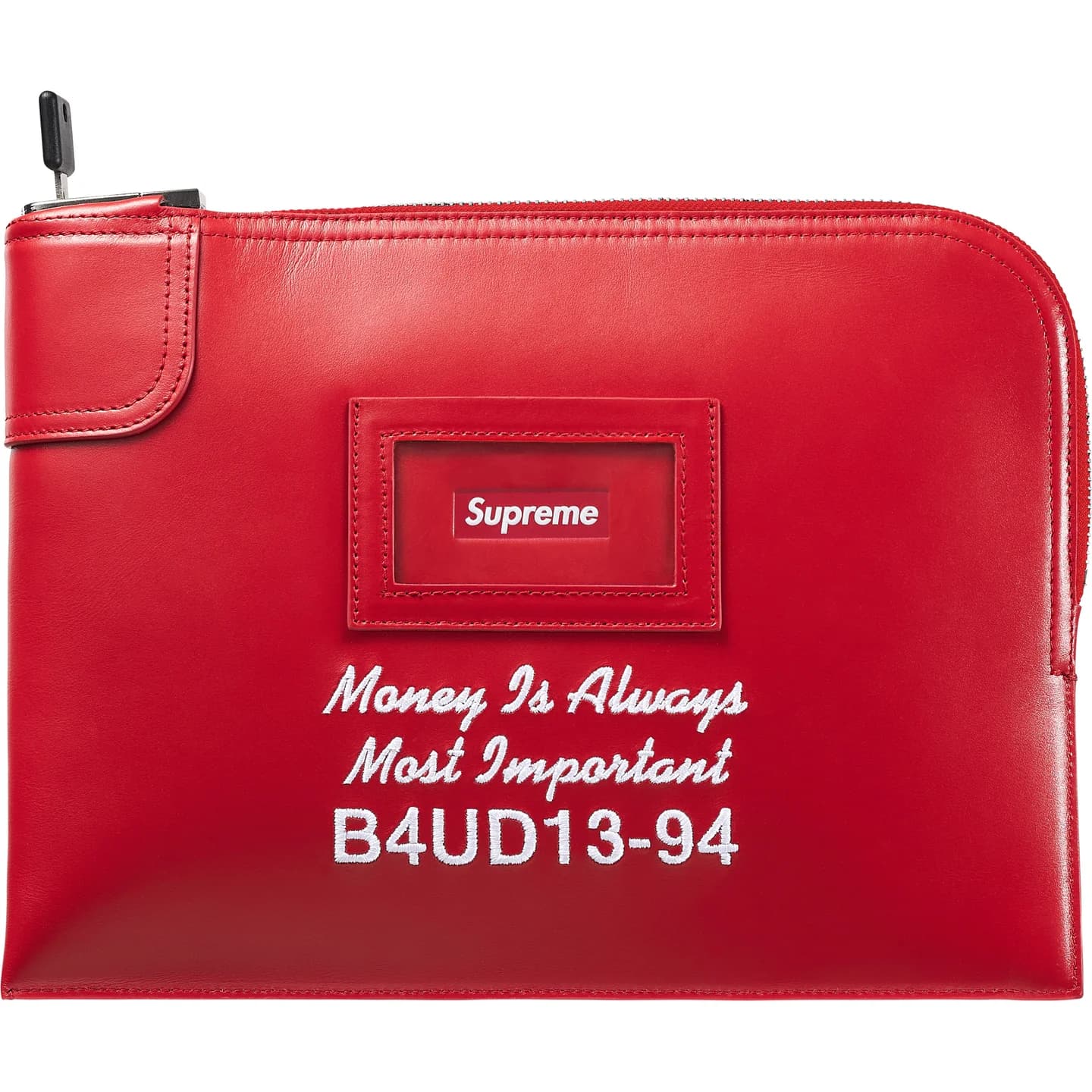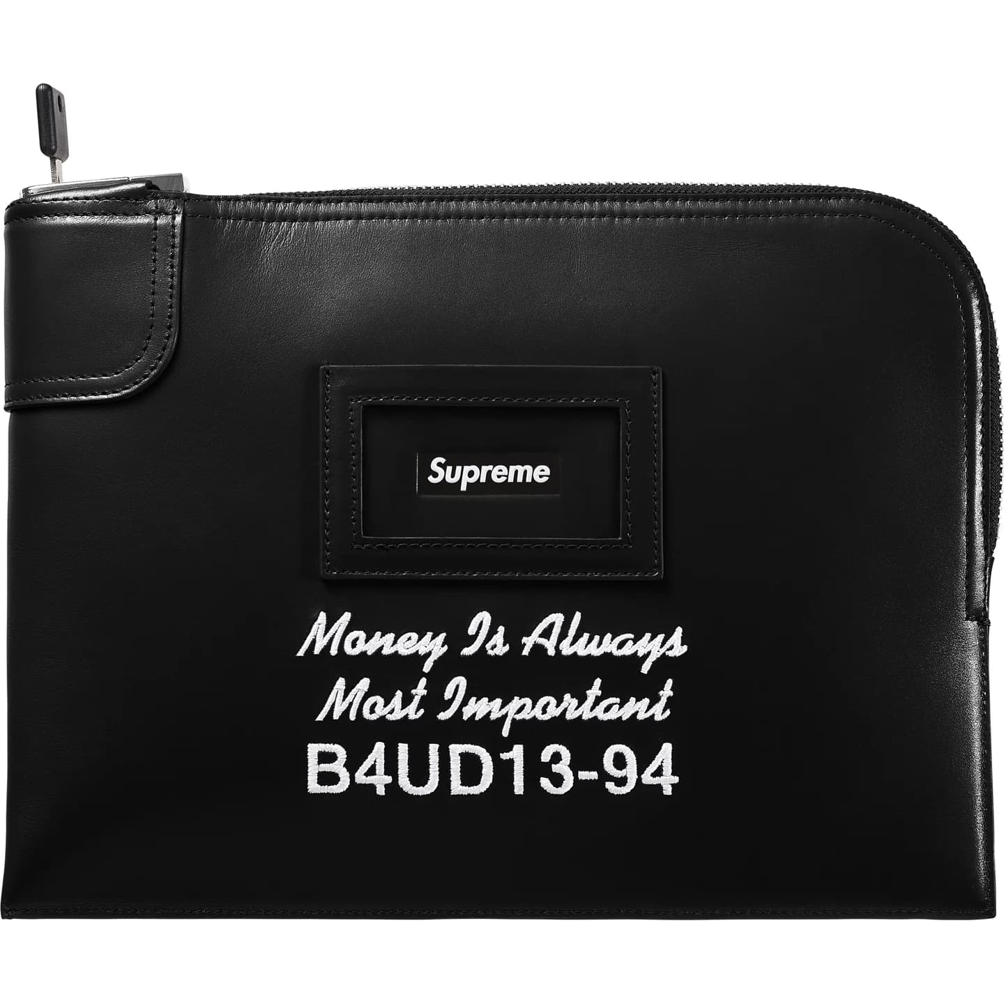 カーフスキンレザーのロック式マネーバッグ。大きさ約30.5 x 23cm