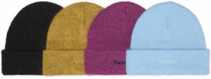 カフにロゴを刺繍したモヘア素材のビーニー。