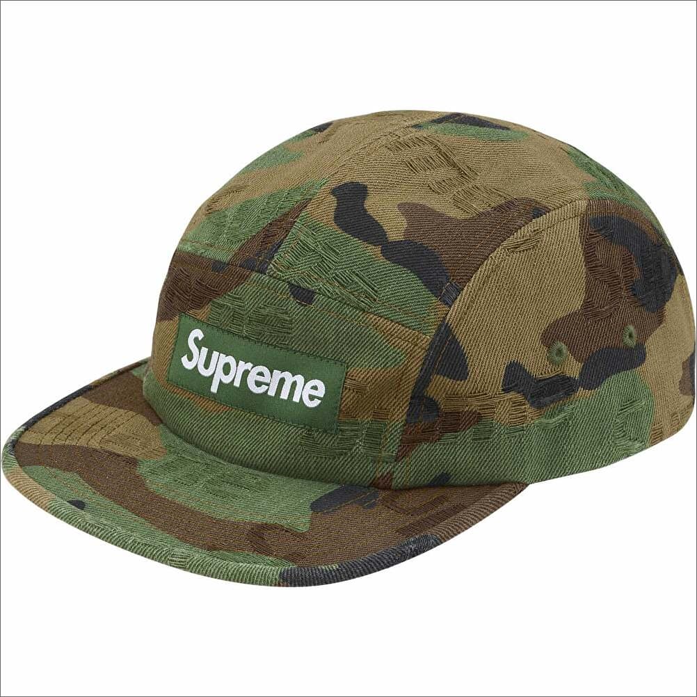 ほつれ加工のジャカードロゴをリピートで入れたデニムキャンプキャップ。