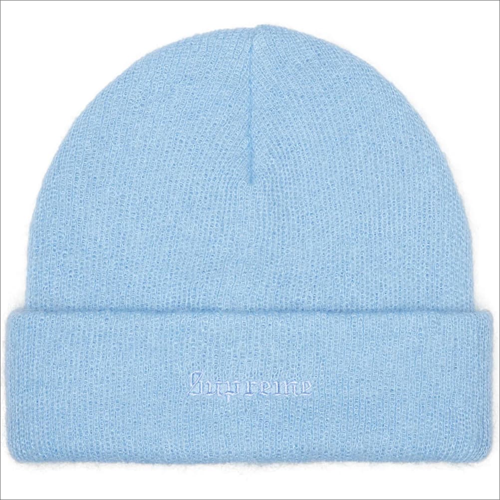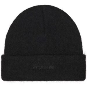 カフにロゴを刺繍したモヘア素材のビーニー。