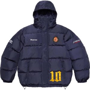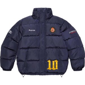 ゼッケンやロゴアップリケ、ウーブンパッチで装飾したサッカージャージをイメージしたデザインのアンブロ製ダウンパファージャケット。フードは収納可能。