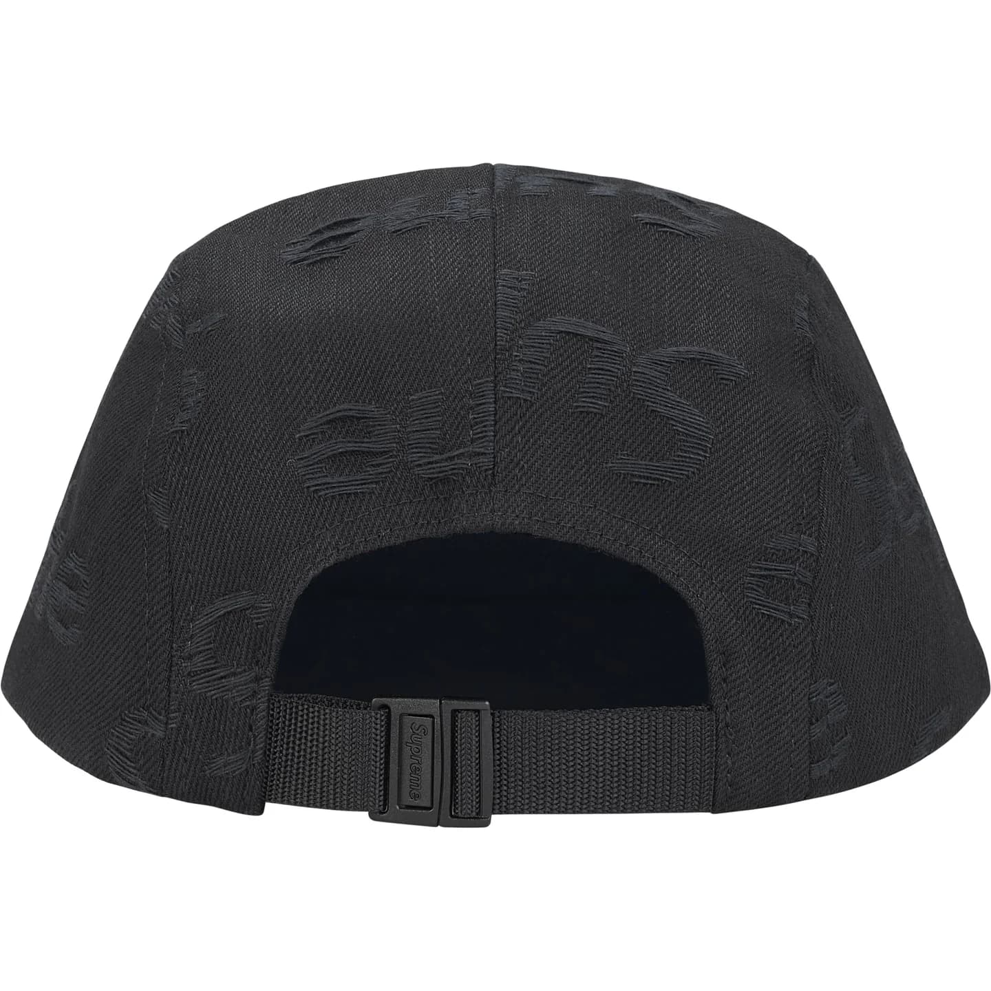 ほつれ加工のジャカードロゴをリピートで入れたデニムキャンプキャップ。