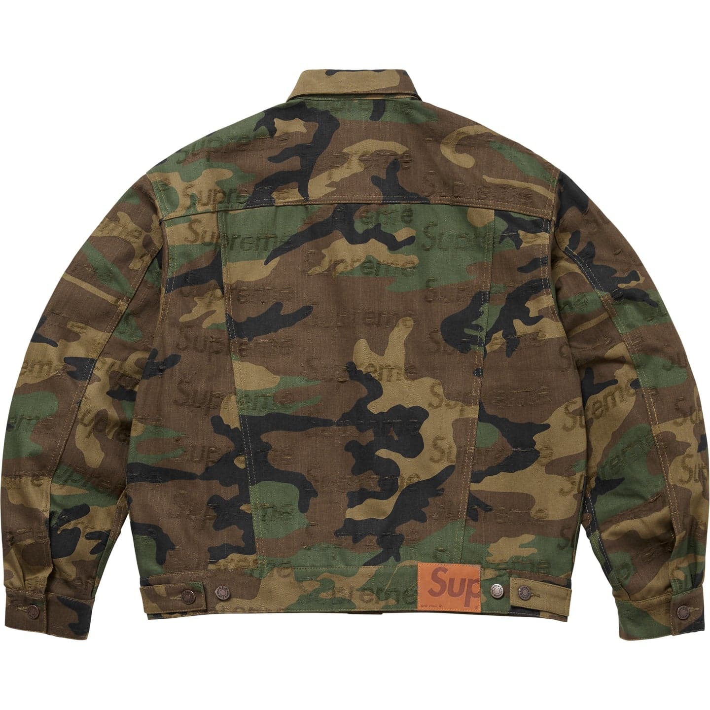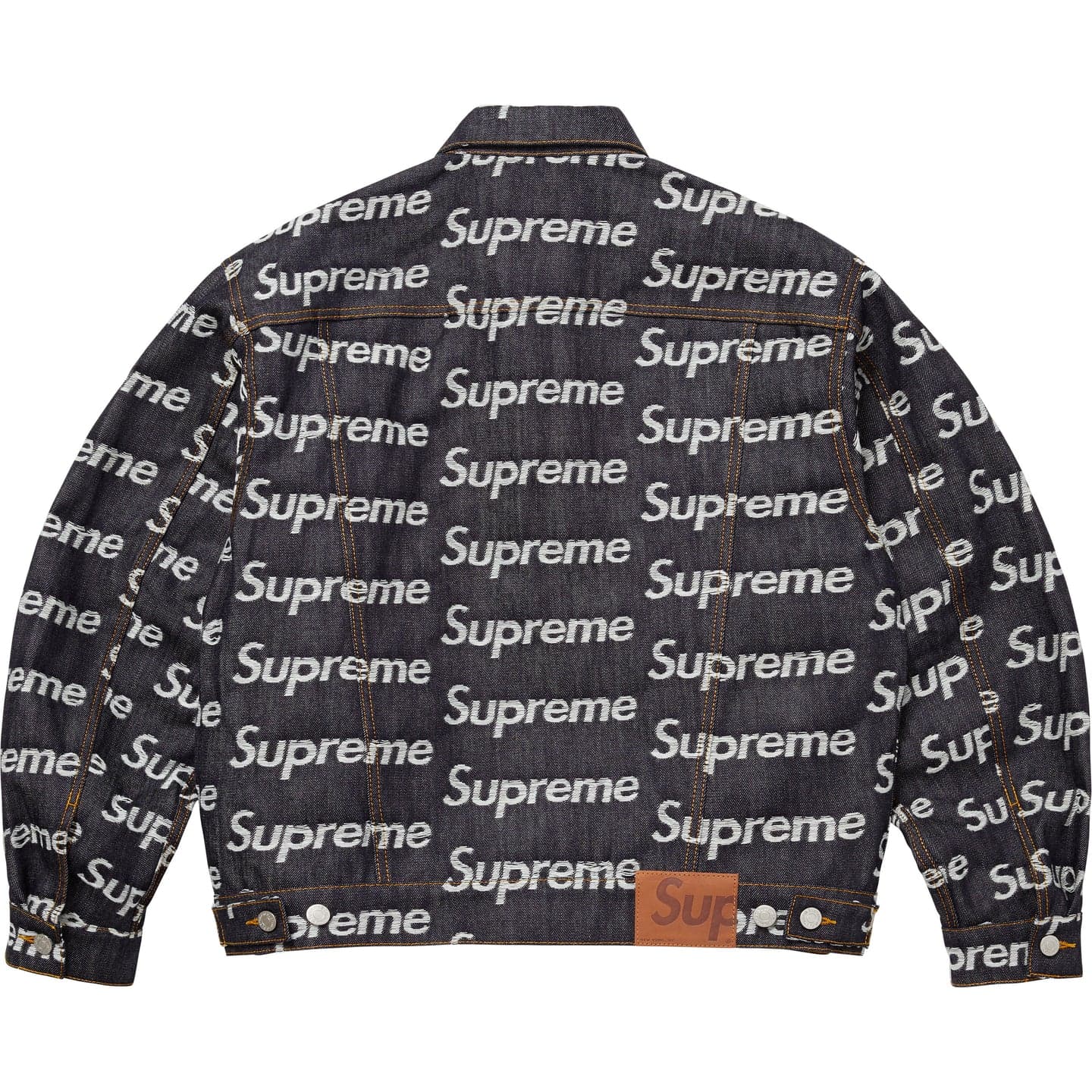 ほつれ加工のジャカードロゴをリピートで入れた14オンスデニムのトラッカージャケット。