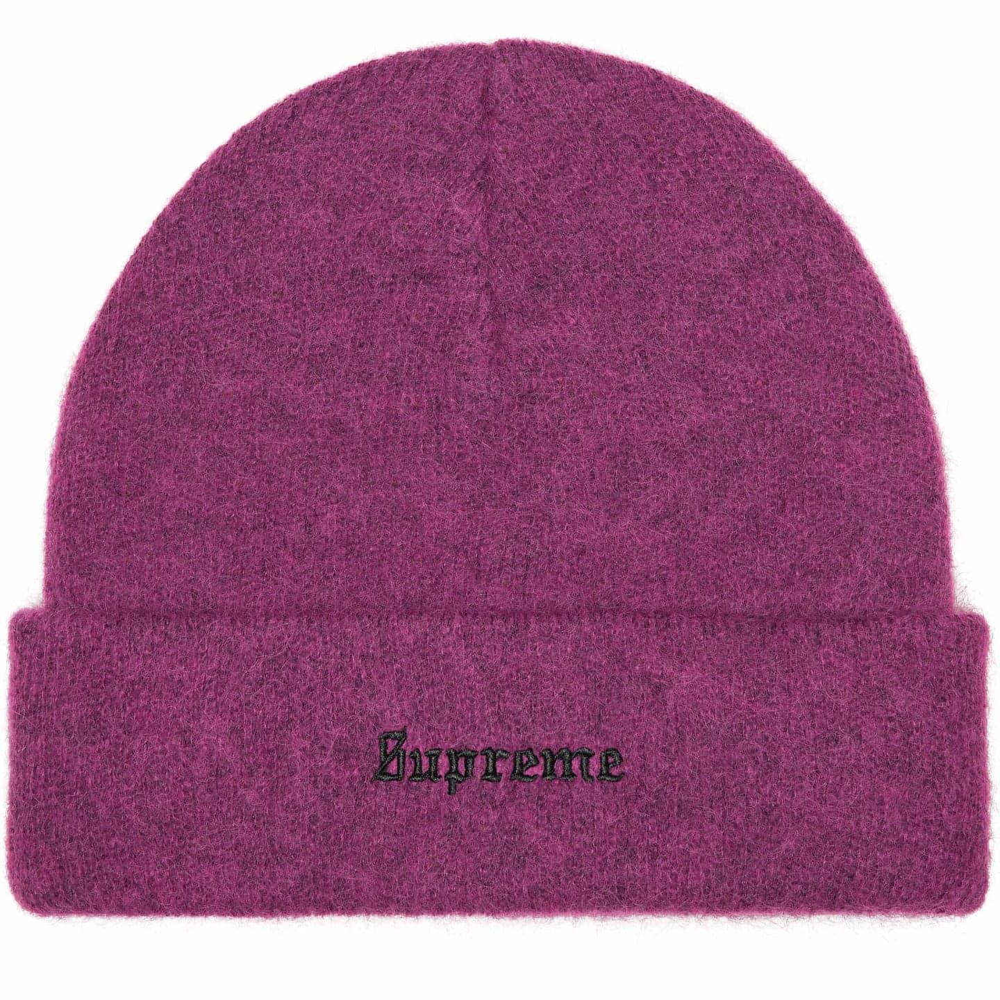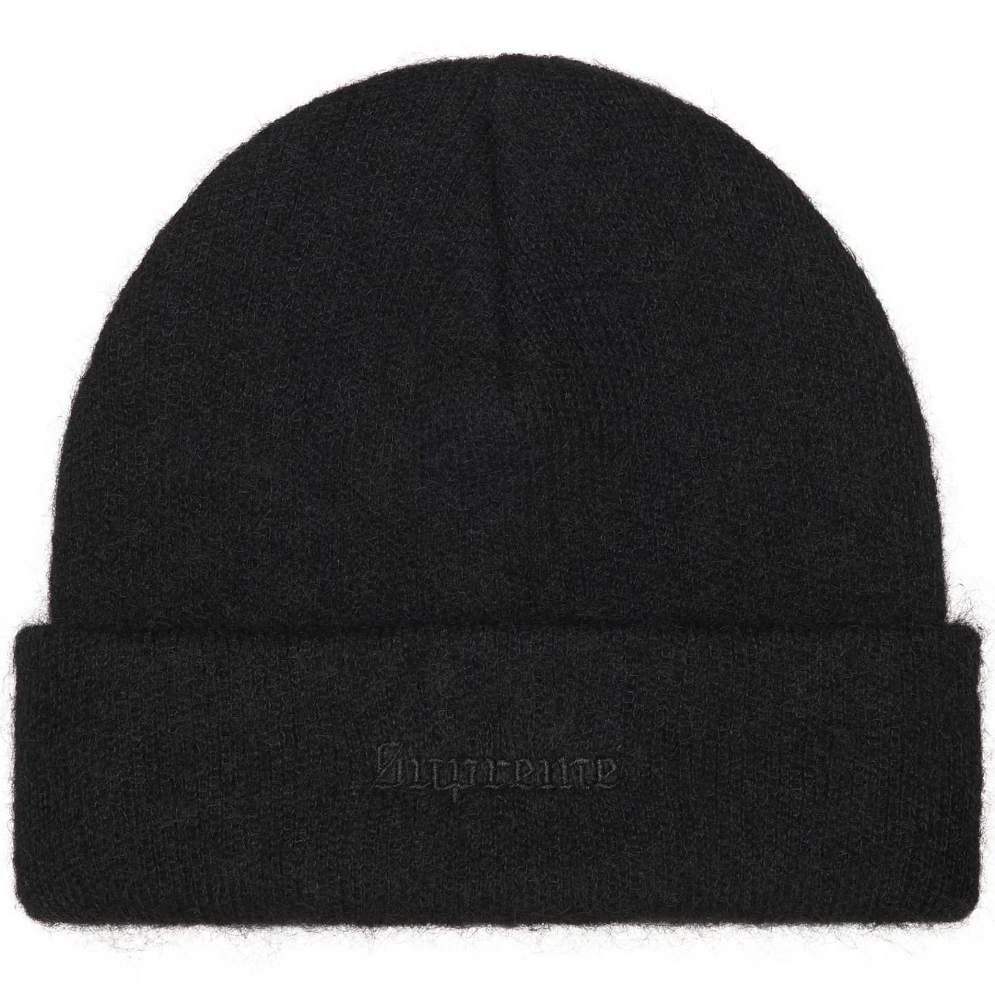 カフにロゴを刺繍したモヘア素材のビーニー。