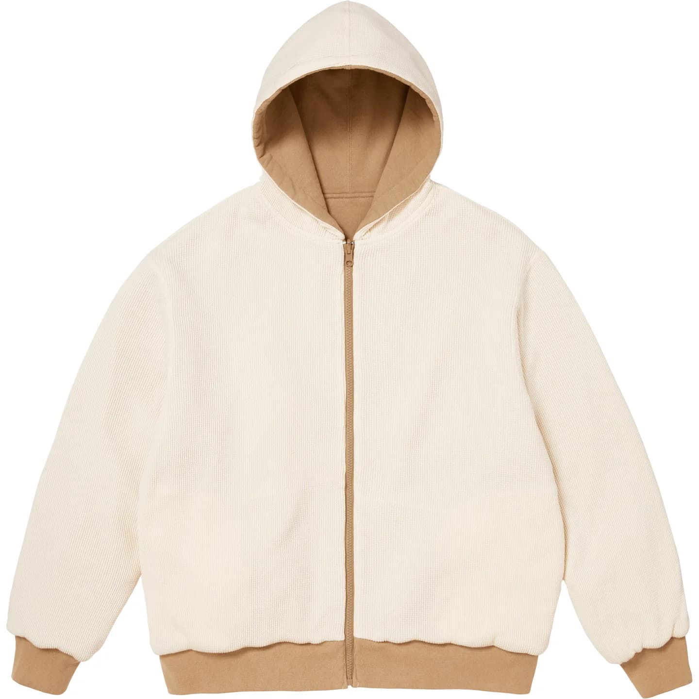 ワークジャケット風デザインのジップアップフーディ。スウェットとコットンワッフル素材のリバーシブル仕様。
