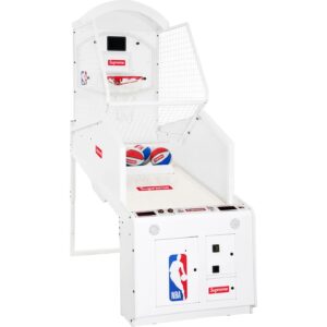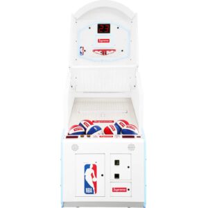 アメリカのアーケードゲーム機メーカー「ICE」製、NBAロゴやボックスロゴで装飾した特別仕様のバスケットボールゲームマシーン。ムービングフープ、LEDライト、サウンドエフェクト機能搭載で、バスケットボールが6個付属。大きさ約251cm 266cm 99cm、重さ約215kg、アメリカ製。