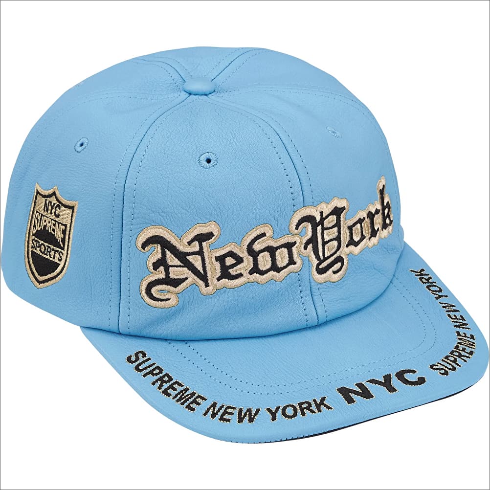 「New York」の文字をフロントやツバに刺繍したレザー素材の6パネルキャップ。