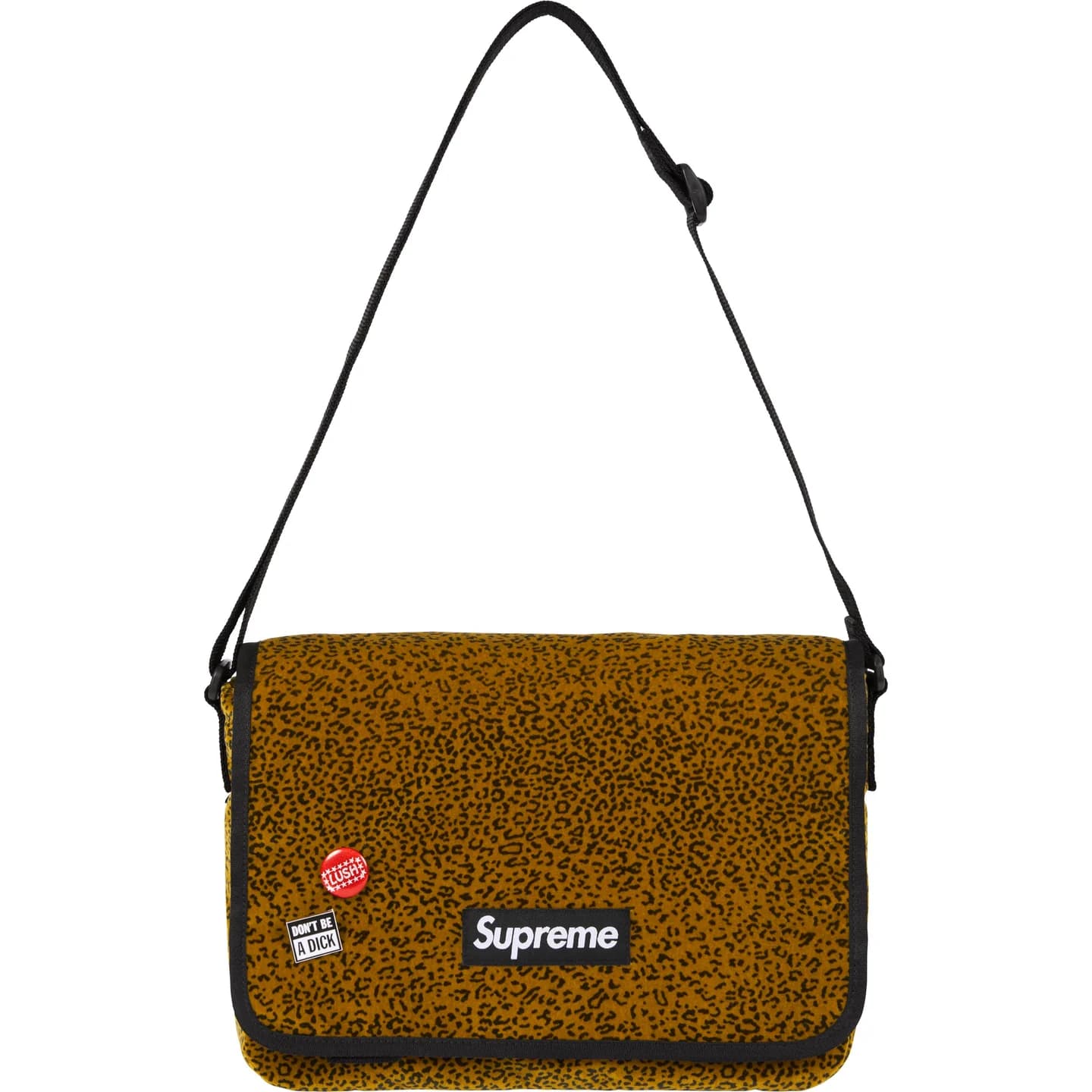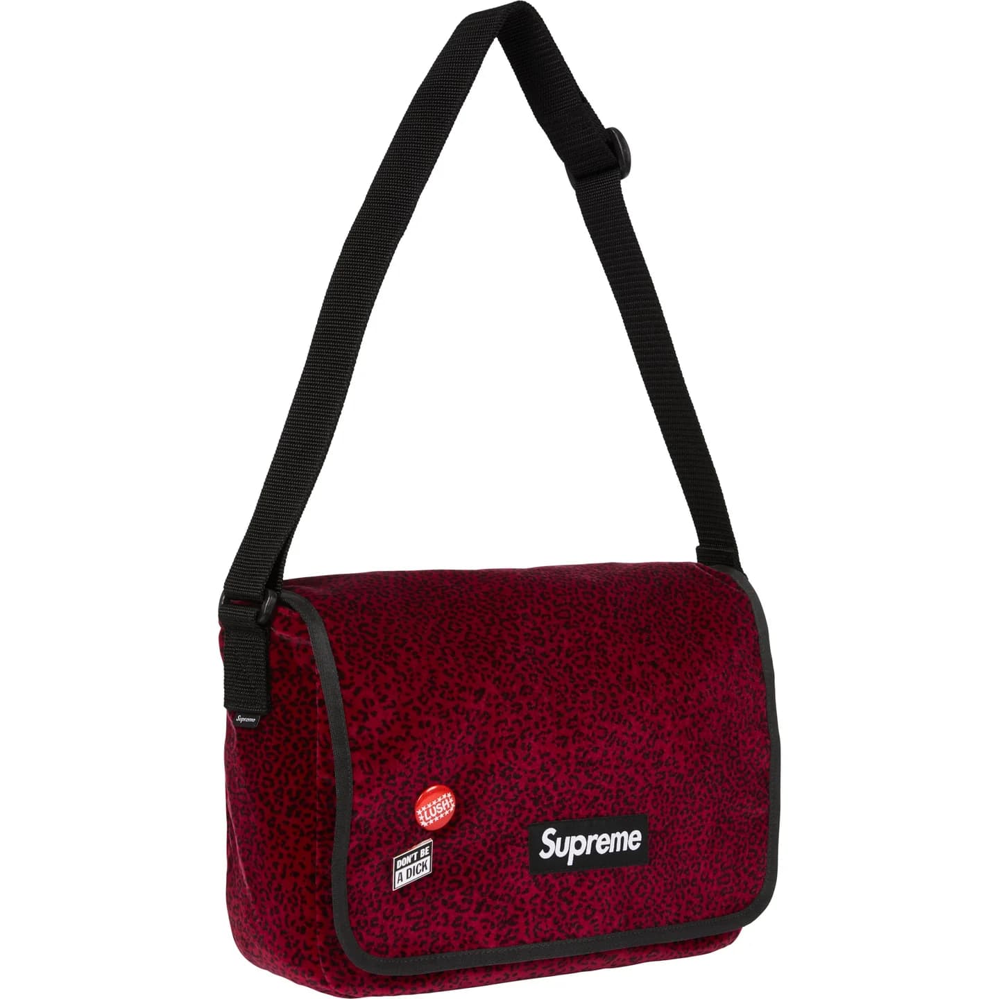 ベルベットフロッキング加工を施したナイロン素材のメッセンジャーバック5L(約36cm 21cm 9cm)ピンズとピンバッジ付き。
