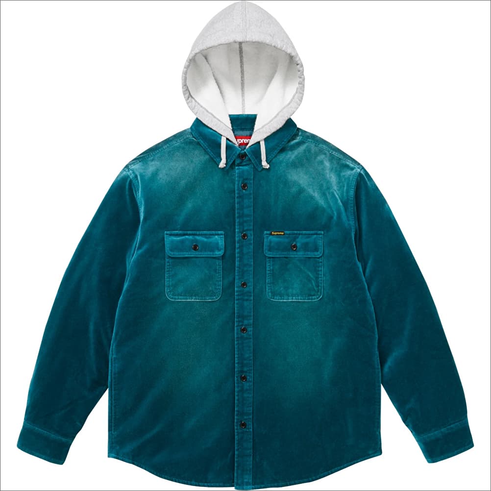 キルティングライナーで保温性を高めたベルベット素材のボディーに、スウェットフードを組み合わせた重ね着風シャツ。