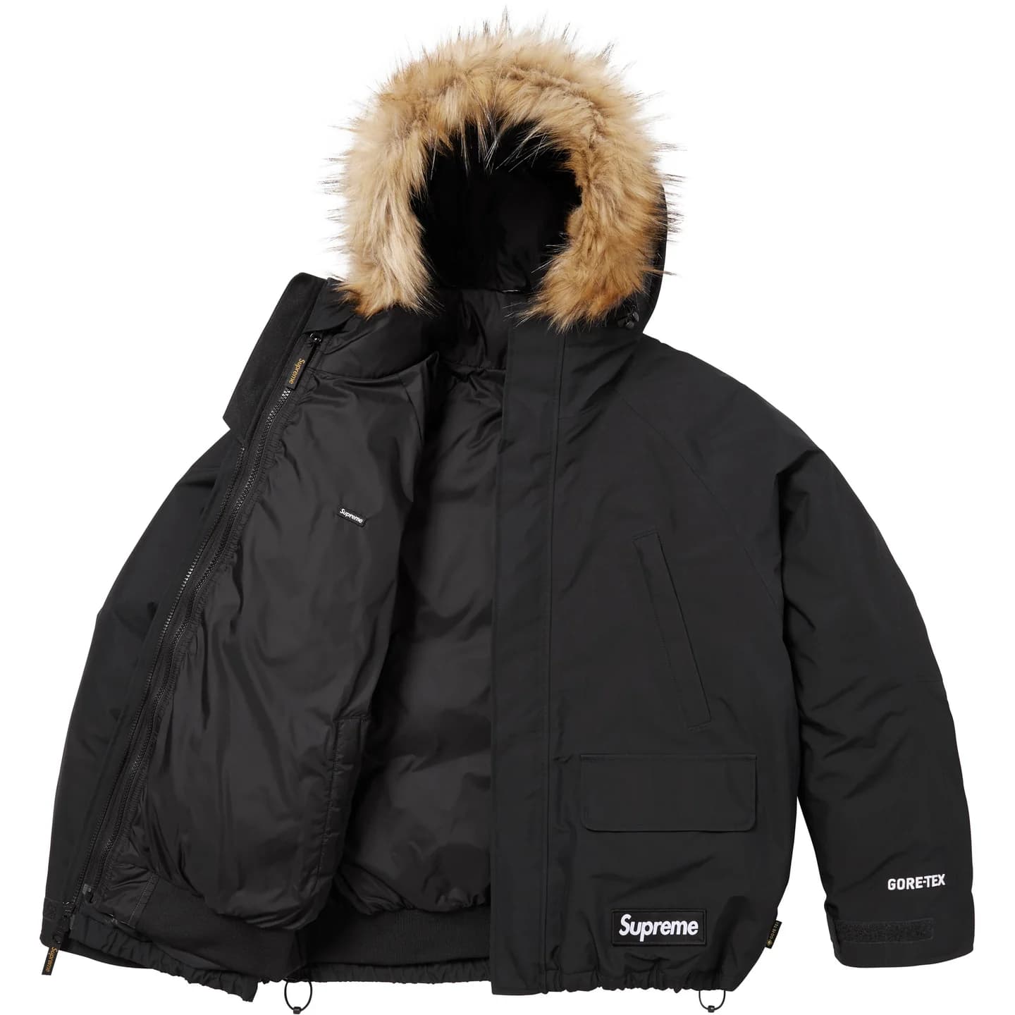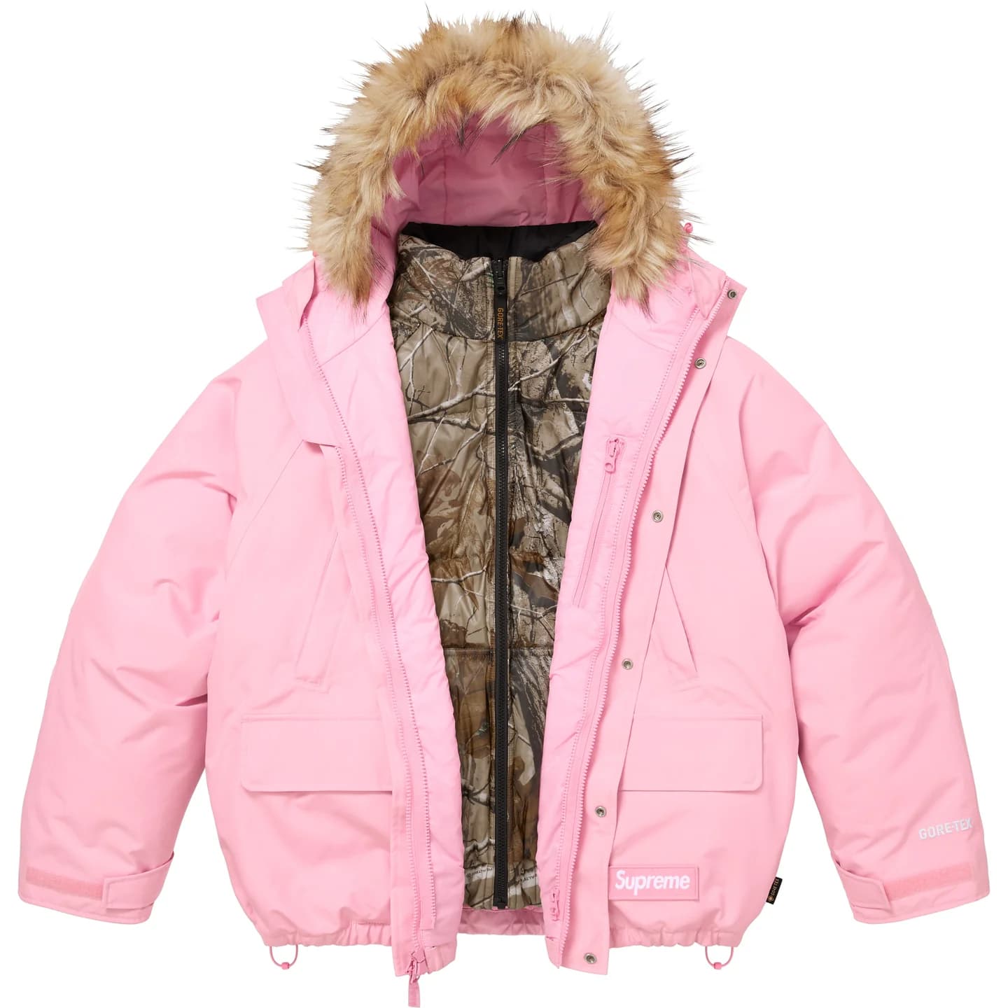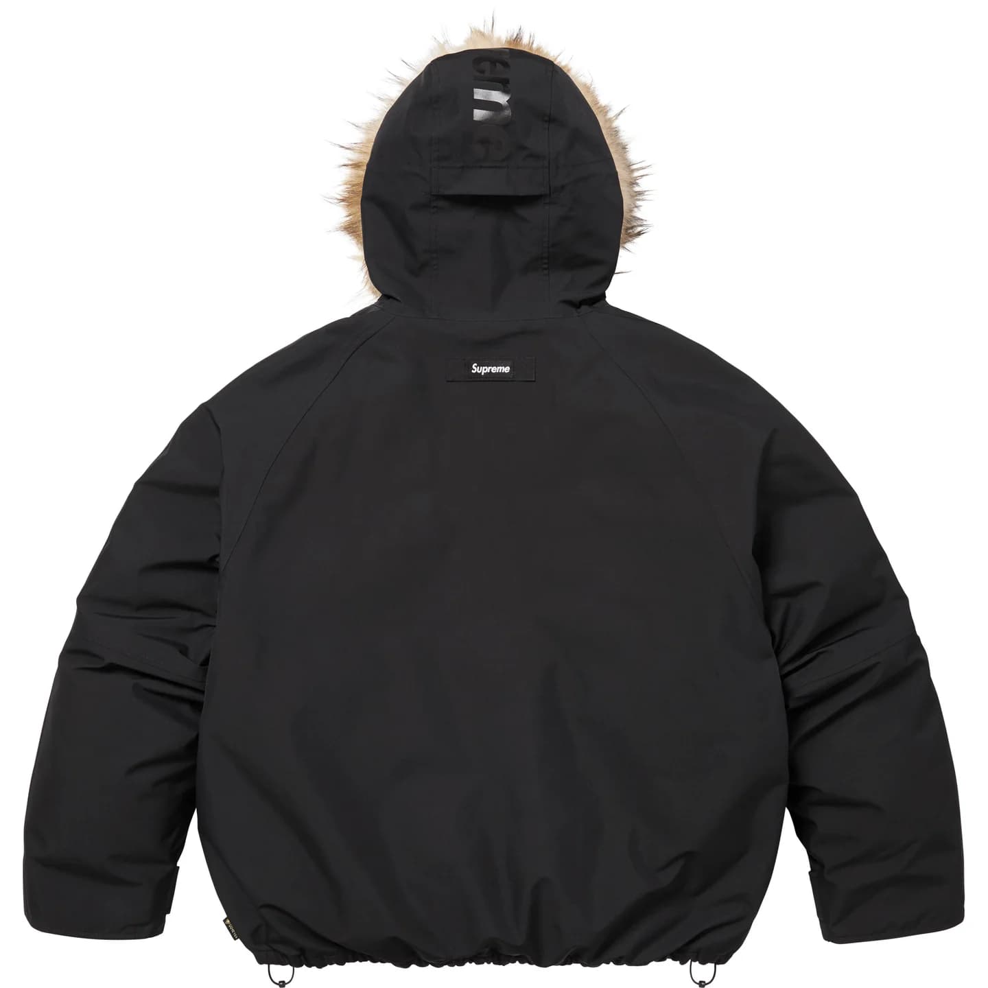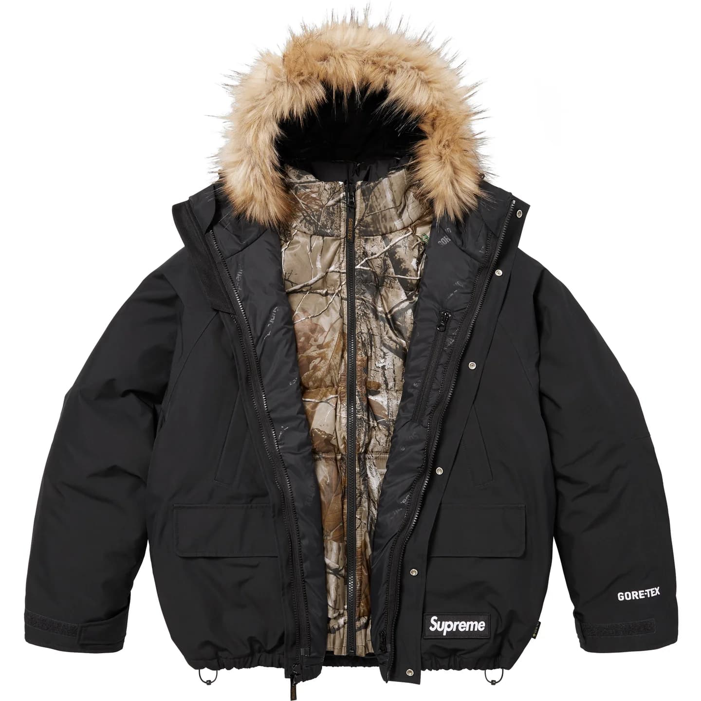 ゴアテックス素材のシェルジャケットに、耐水ナイロン素材のリバーシブル700フィルダウンジャケットが付いた2in1ジャケット。ファーフードは脱着可能。