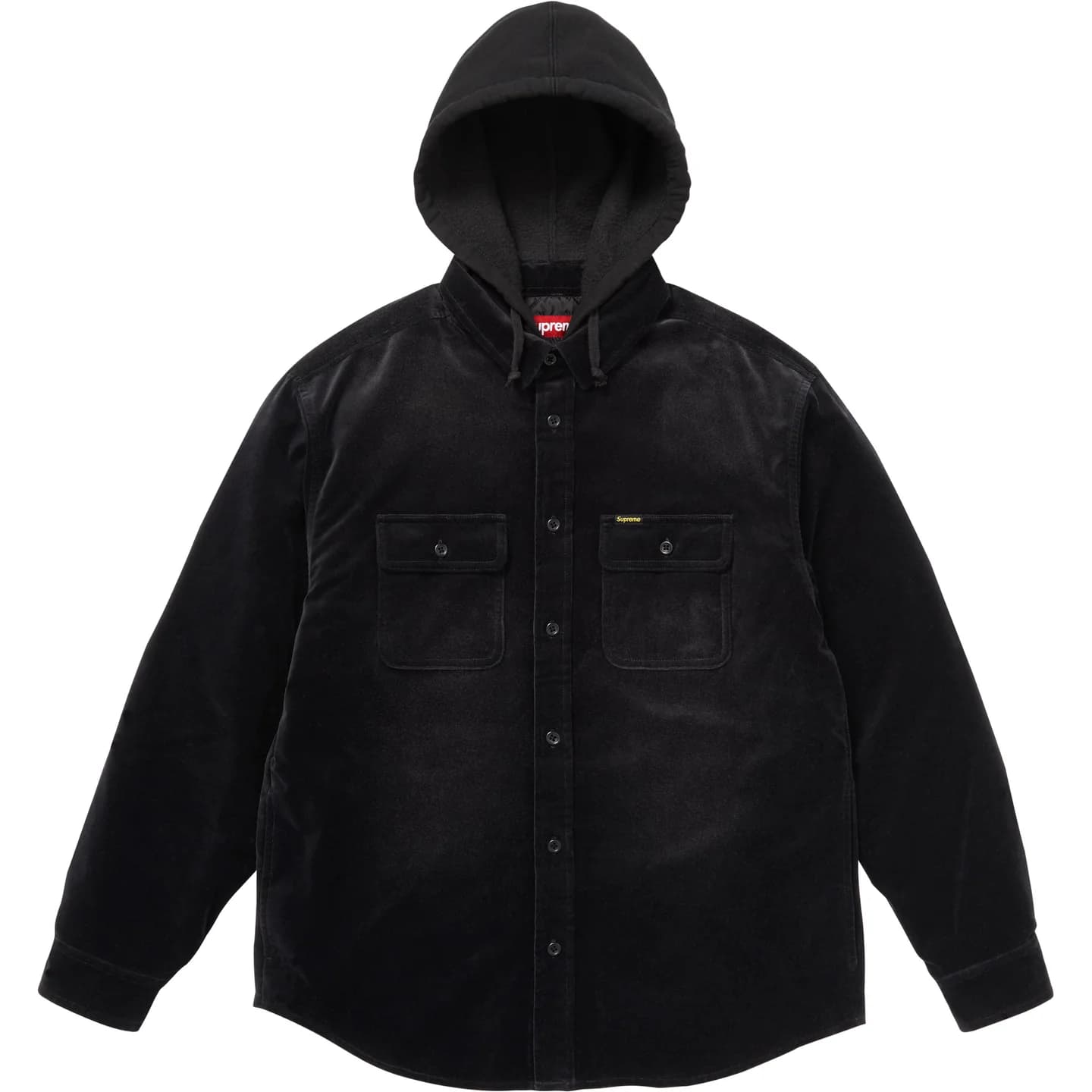 キルティングライナーで保温性を高めたベルベット素材のボディーに、スウェットフードを組み合わせた重ね着風シャツ。