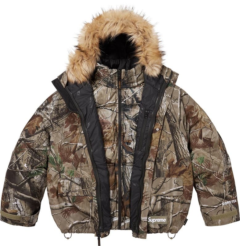 ゴアテックス素材のシェルジャケットに、耐水ナイロン素材のリバーシブル700フィルダウンジャケットが付いた2in1ジャケット。ファーフードは脱着可能。