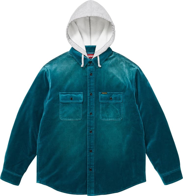 キルティングライナーで保温性を高めたベルベット素材のボディーに、スウェットフードを組み合わせた重ね着風シャツ。