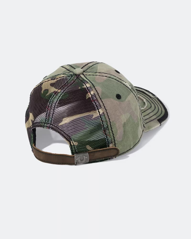 切りっぱなしの生地やステッチワークが特徴的なメッシュバックキャップ。