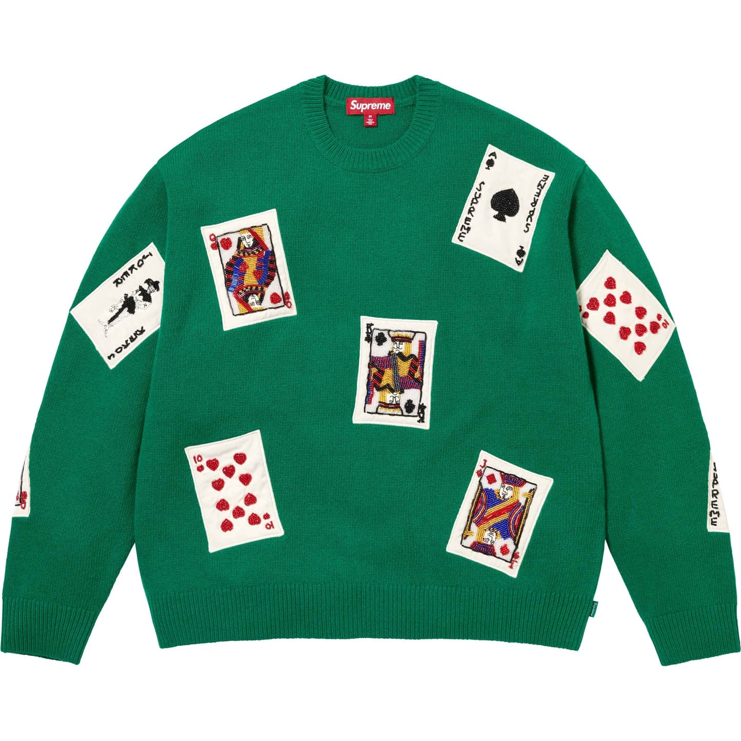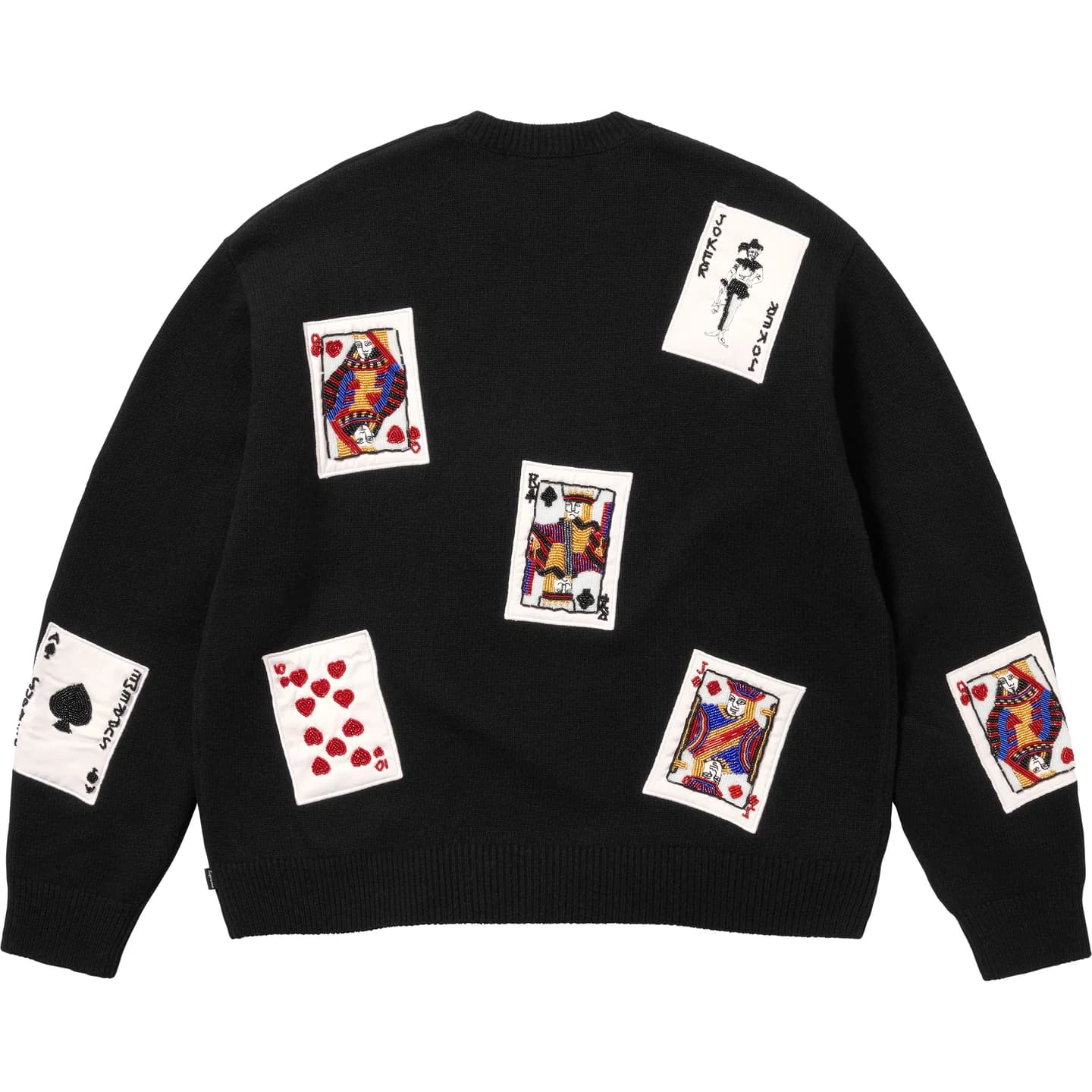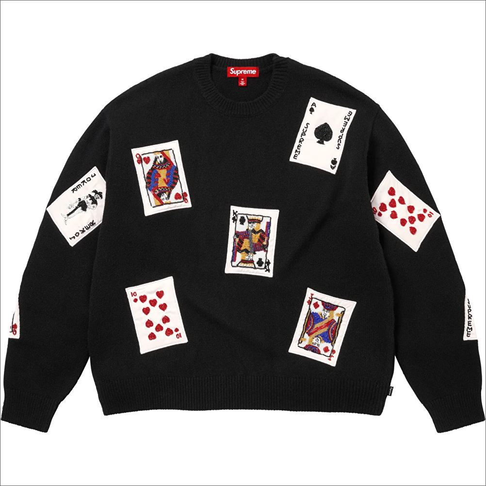 ビーズで描かれたトランプサテンアップリケがポップな印象のウールブレンドセーター。ビーズ加工は職人の手作業によるもの。