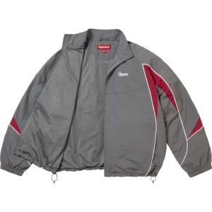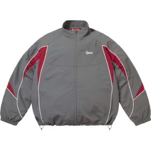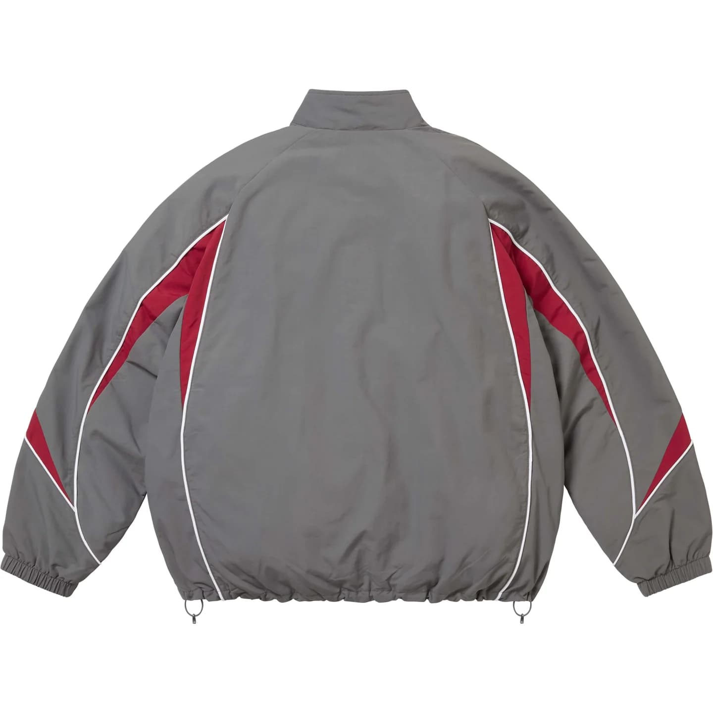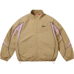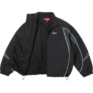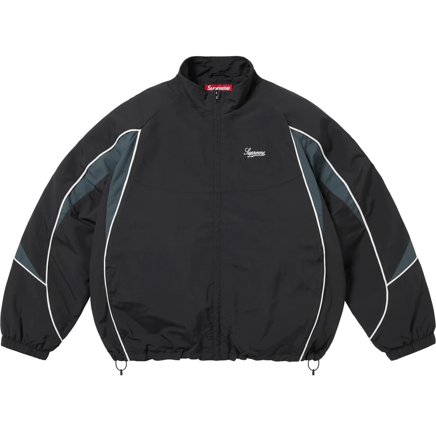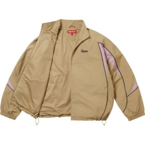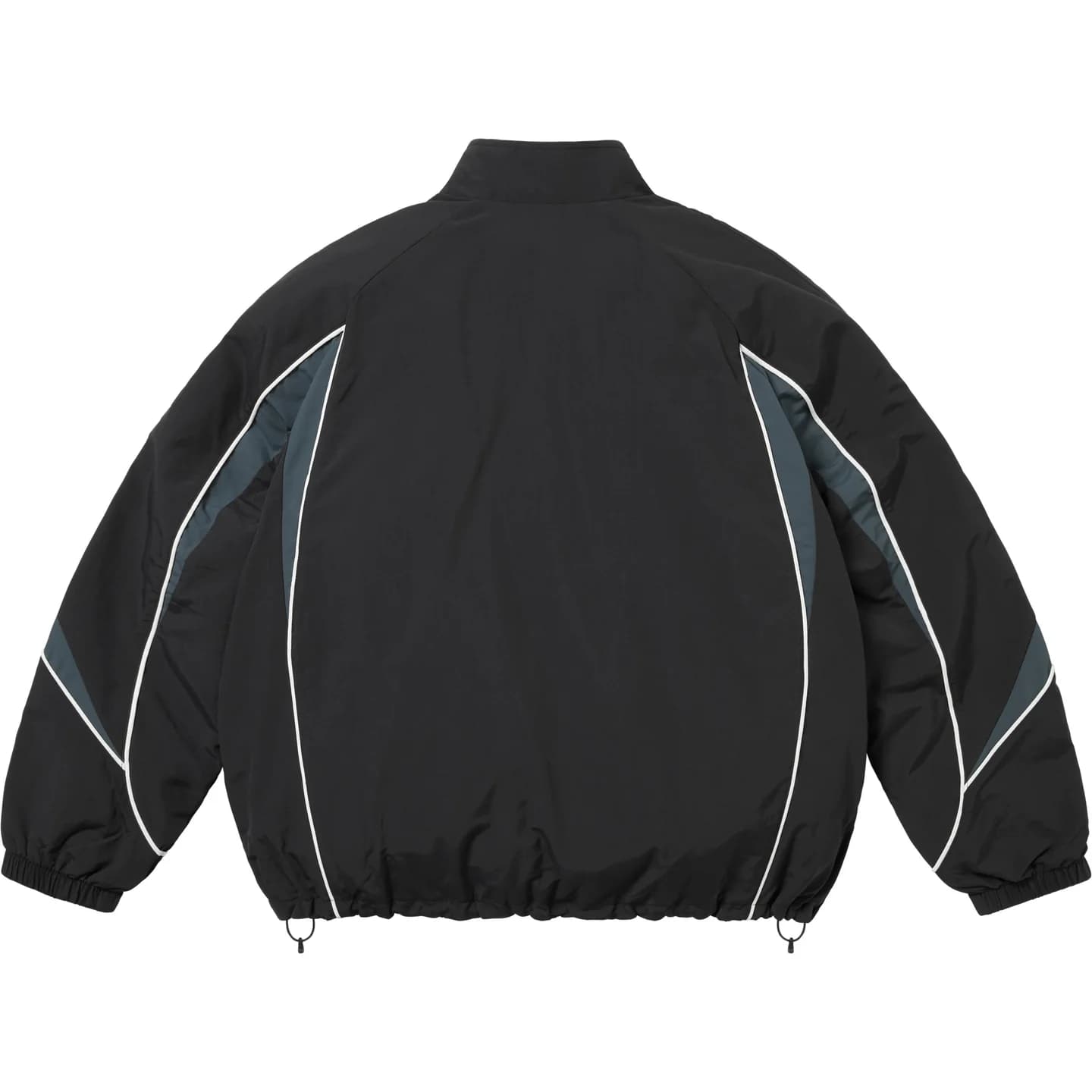 ボディーと対照的なカラーのパインピングラインがアクセントの耐水サプレックスナイロン素材のトラックジャケット。チェストのロゴは刺繍。