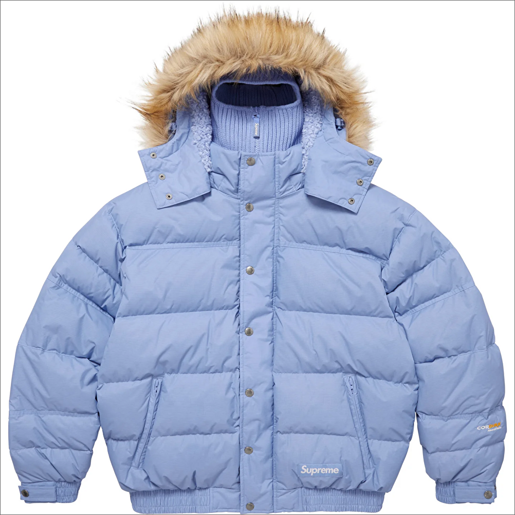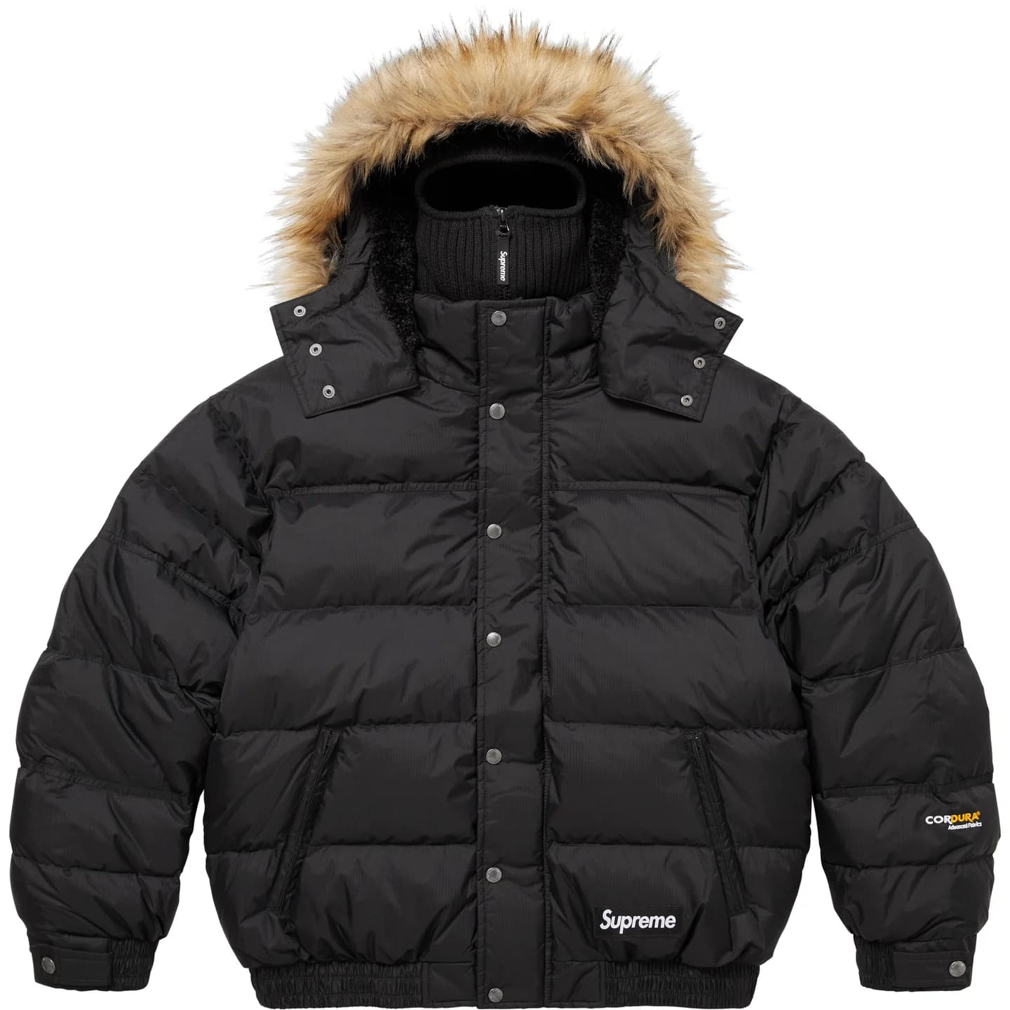 700フィルのダウンを充填した耐水コーデュラリップストップナイロン素材のフェイスマスク付きダウンジャケット。フードとフェイスマスクは脱着可能。