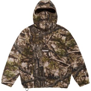 口元まで覆うことのできるフードが付いたポーラテック200フリース素材のハーフジッププルオーバー。