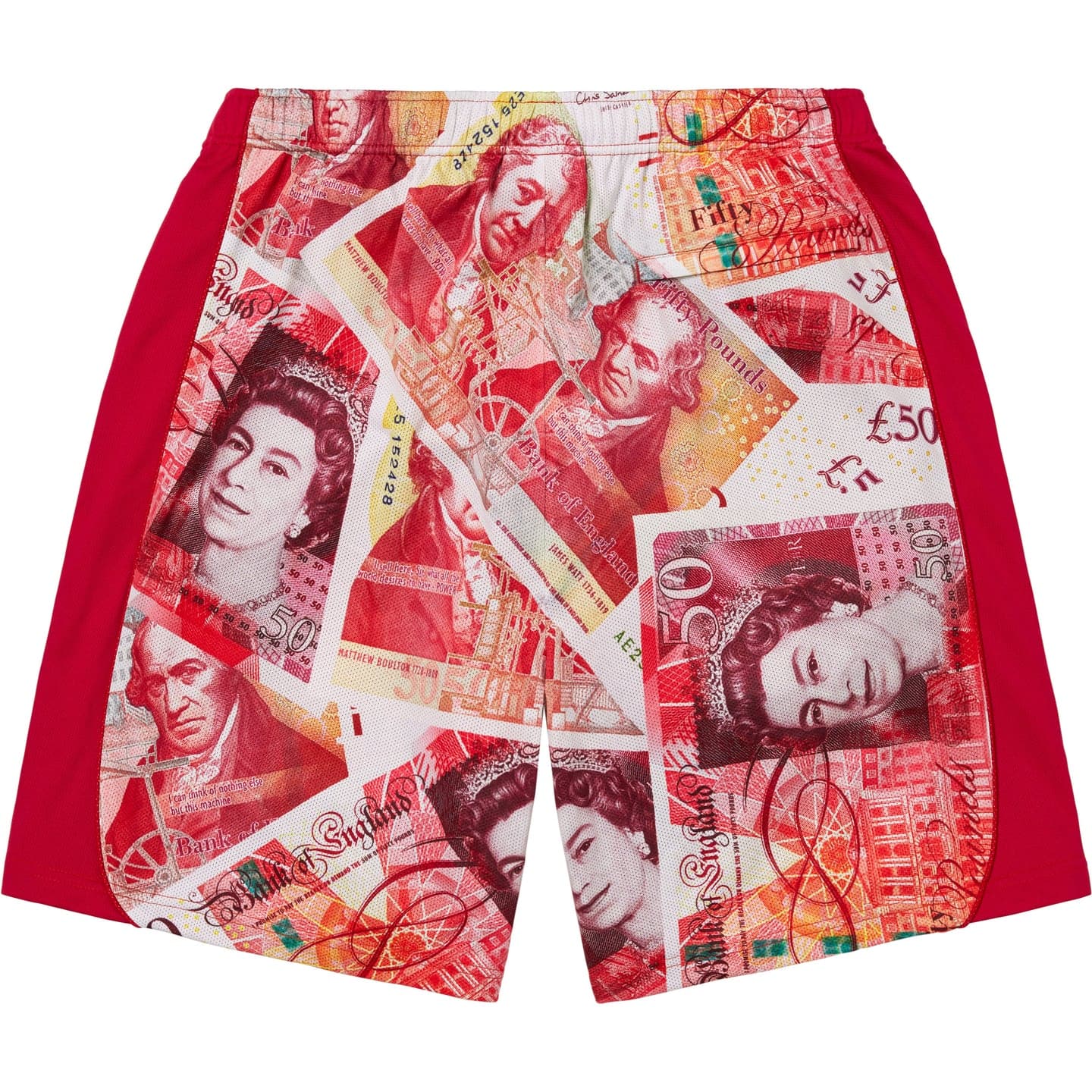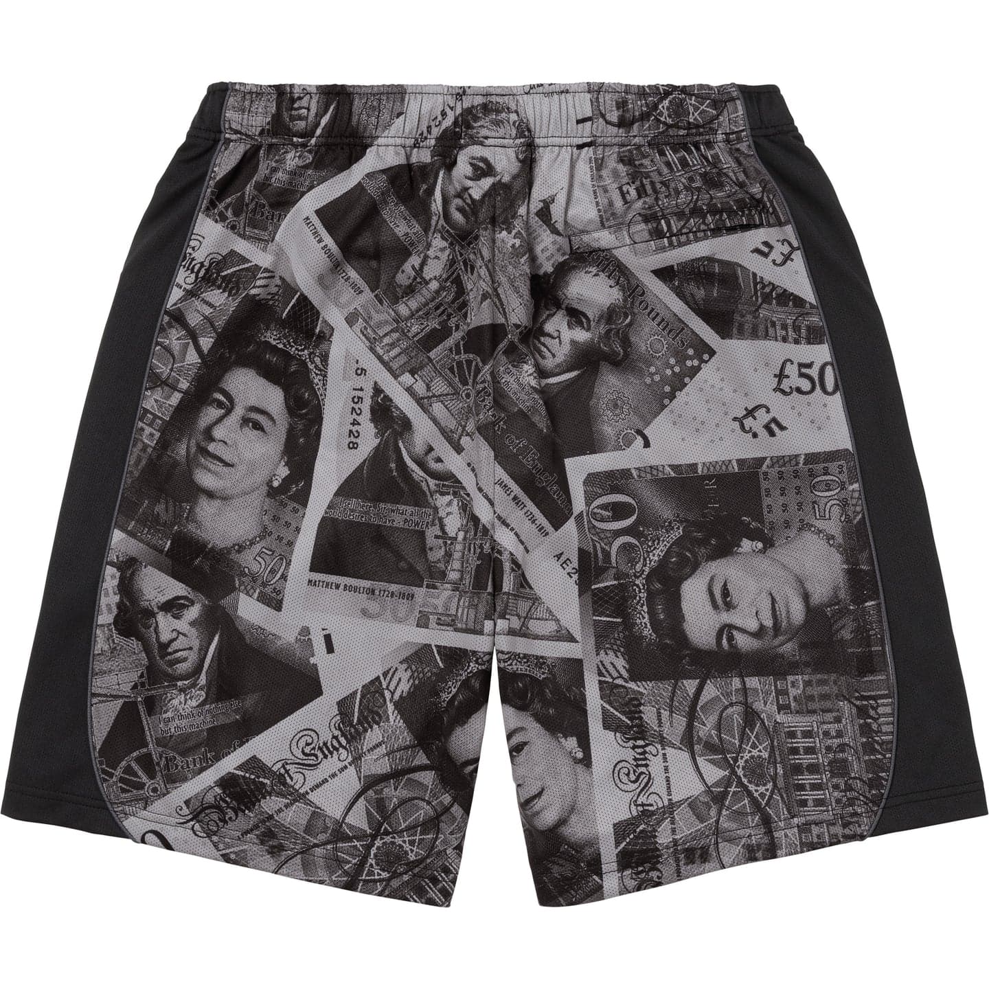 イギリスのポンド紙幣のデザインを総柄で落とし込んだポリエステル素材のサッカーショーツ。