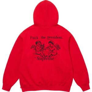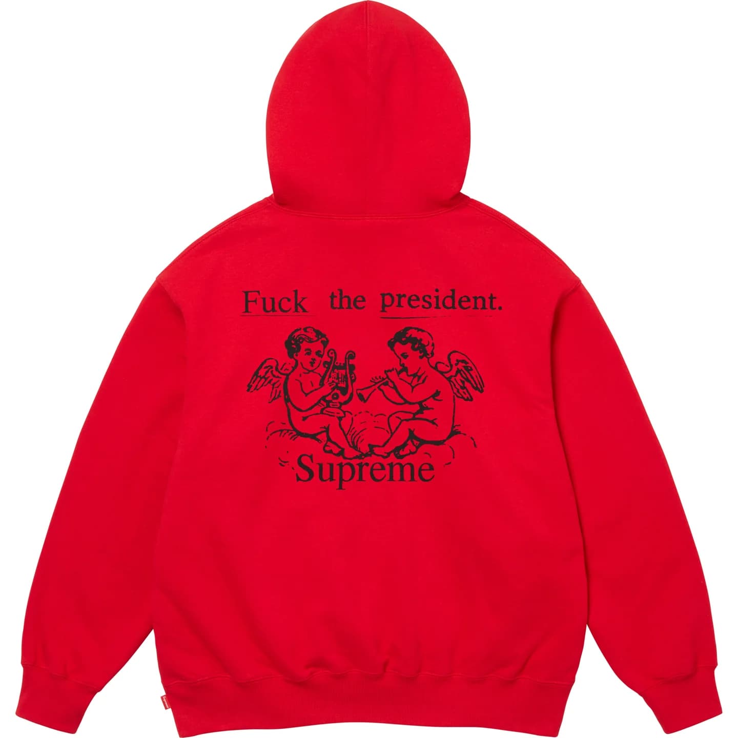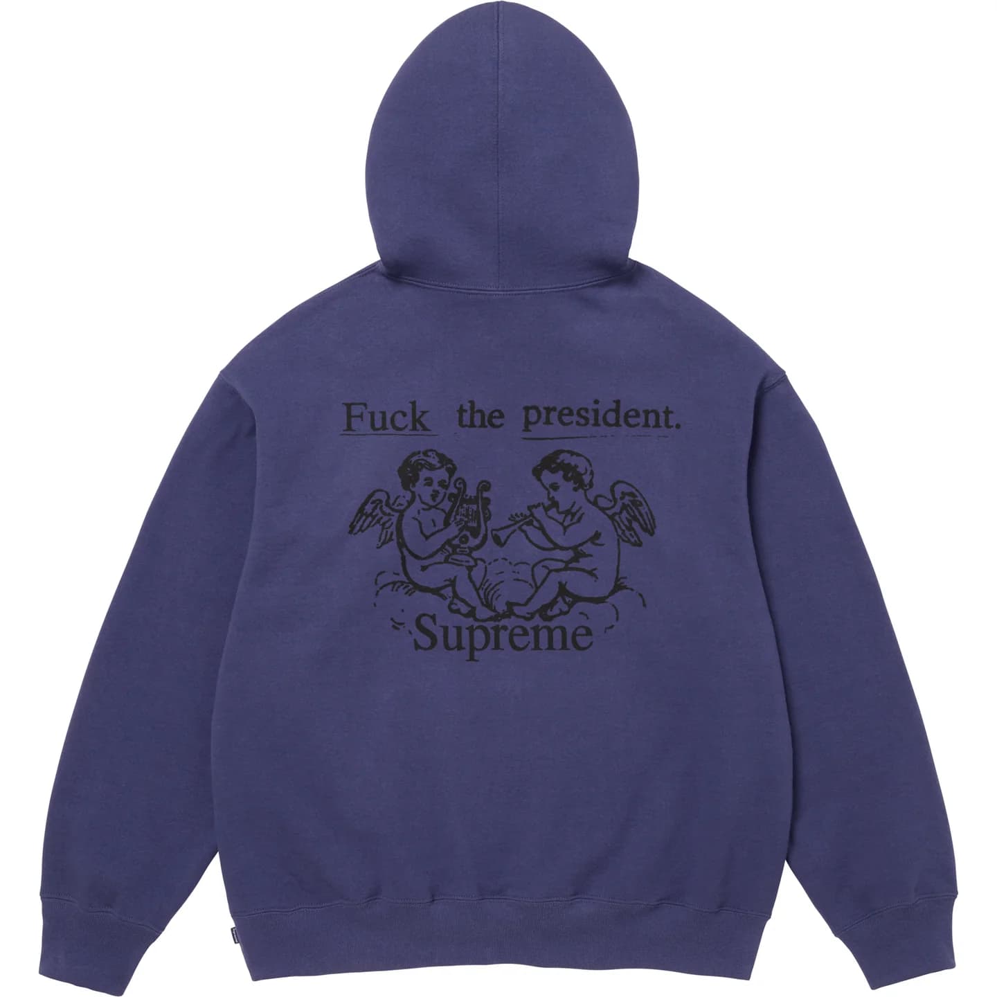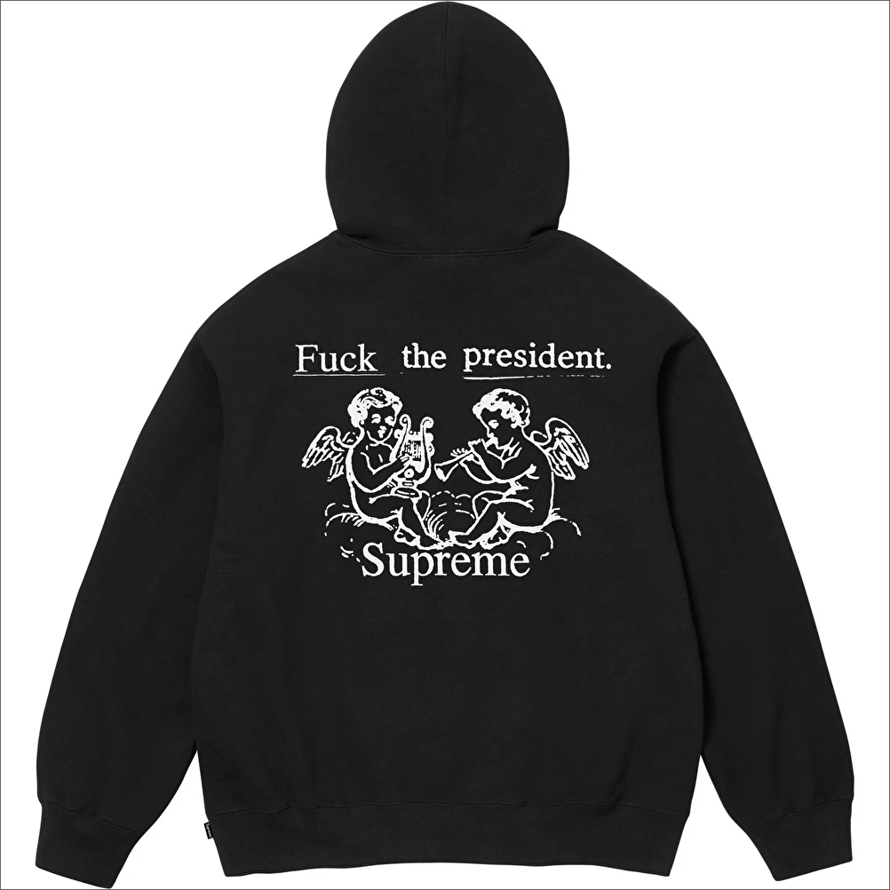 2017SSのアーカイブデザイン、「Fuck the president」という挑発的なメッセージと楽器を演奏する二人の天使をバックにプリントしたヘビーウェイトコットン素材のフーディ。