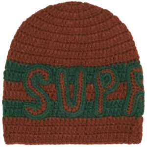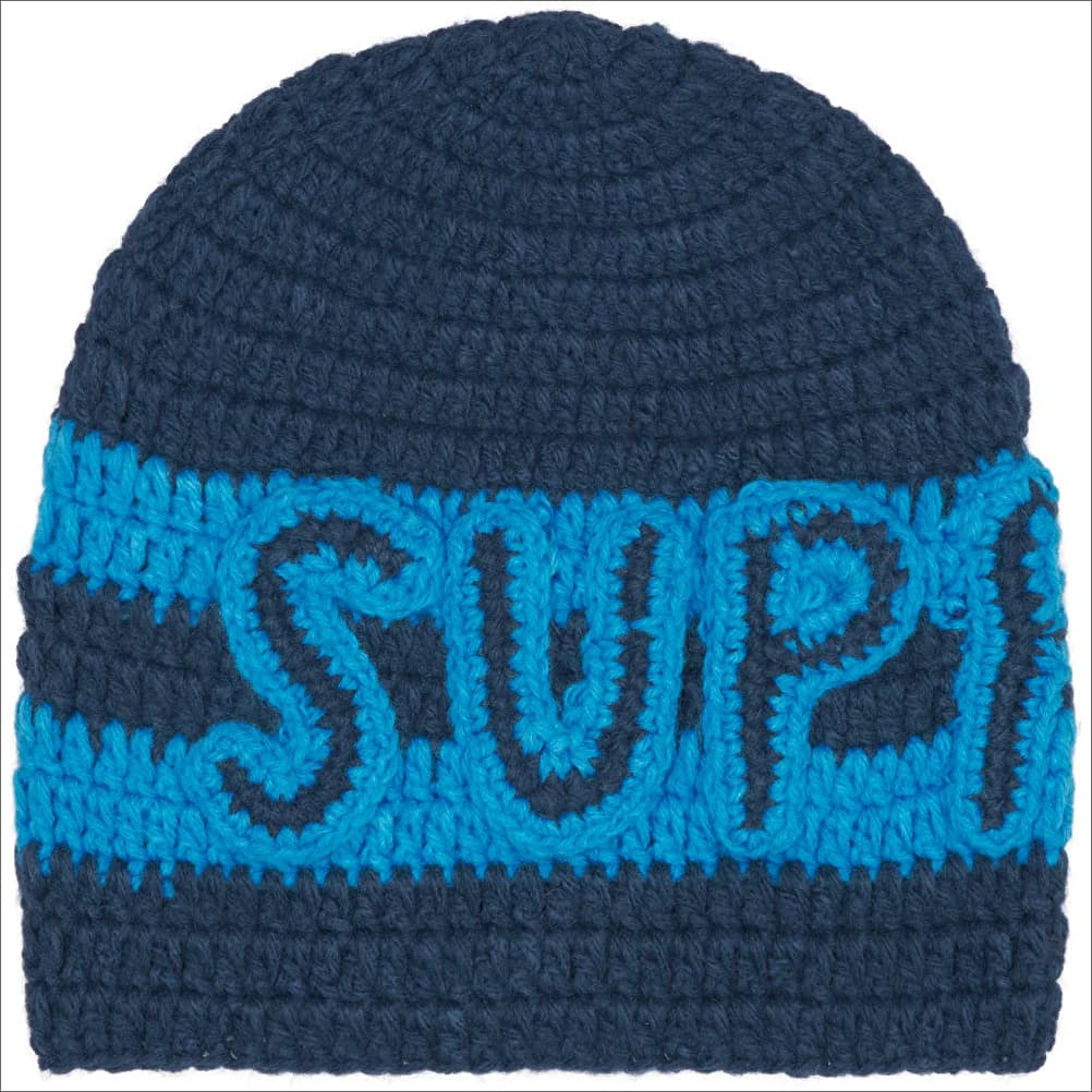 ポップな字体の大きなロゴを編み込んだ手編みのような雰囲気を持ったかぎ針編みシングルカフビーニー。