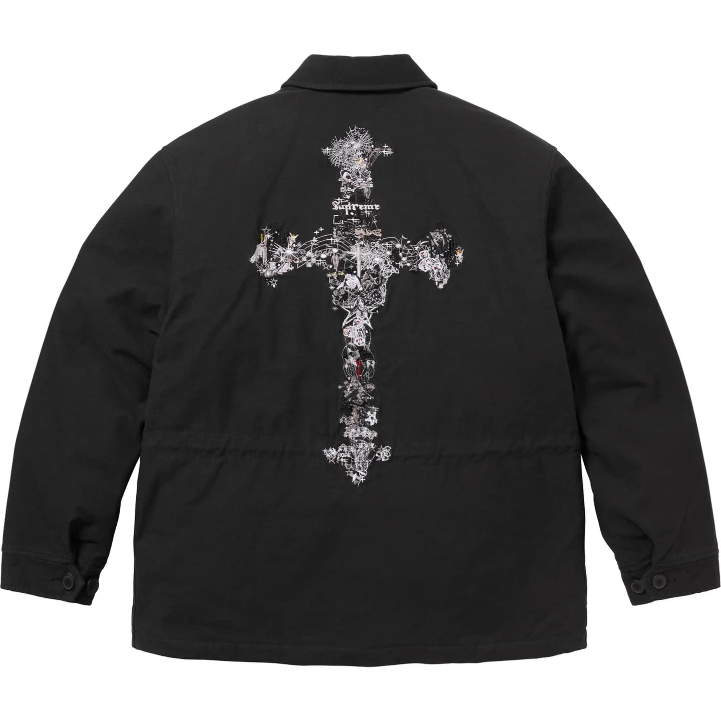 葵産業が十字架の豪華な刺繍を施したアメリカのミリタリーブランドの名門アルファ社製「M52ミリタリージャケット」。生地はミルスペック(米国防総省が定めた軍事規格)準拠のナイロンとコットンの混紡ツイル生地を採用、内側はキルティングライナーで保温性を高めてある。