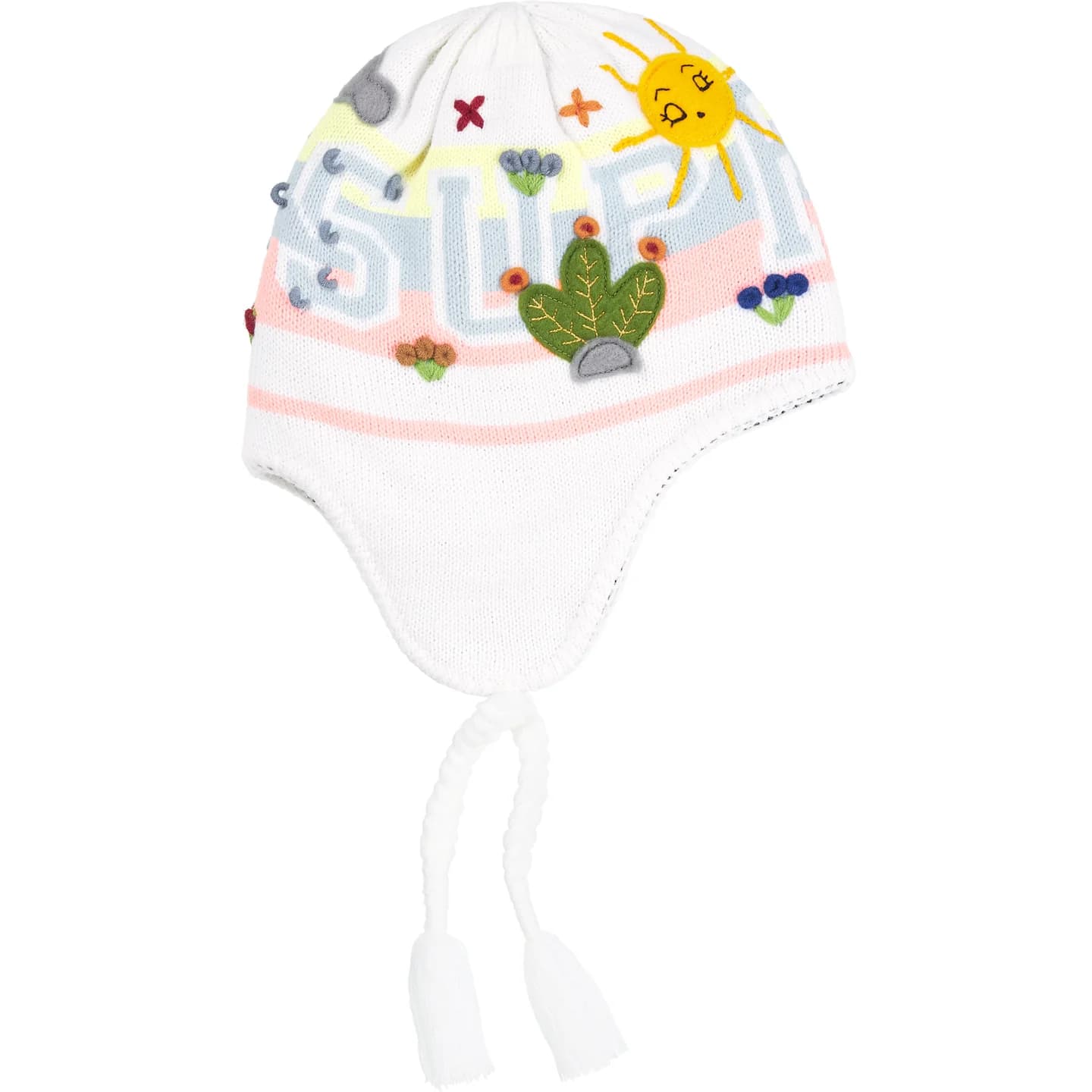 動物のフェルトアップリケや花の刺繍がキュートなイヤーフラップ付きビーニー。