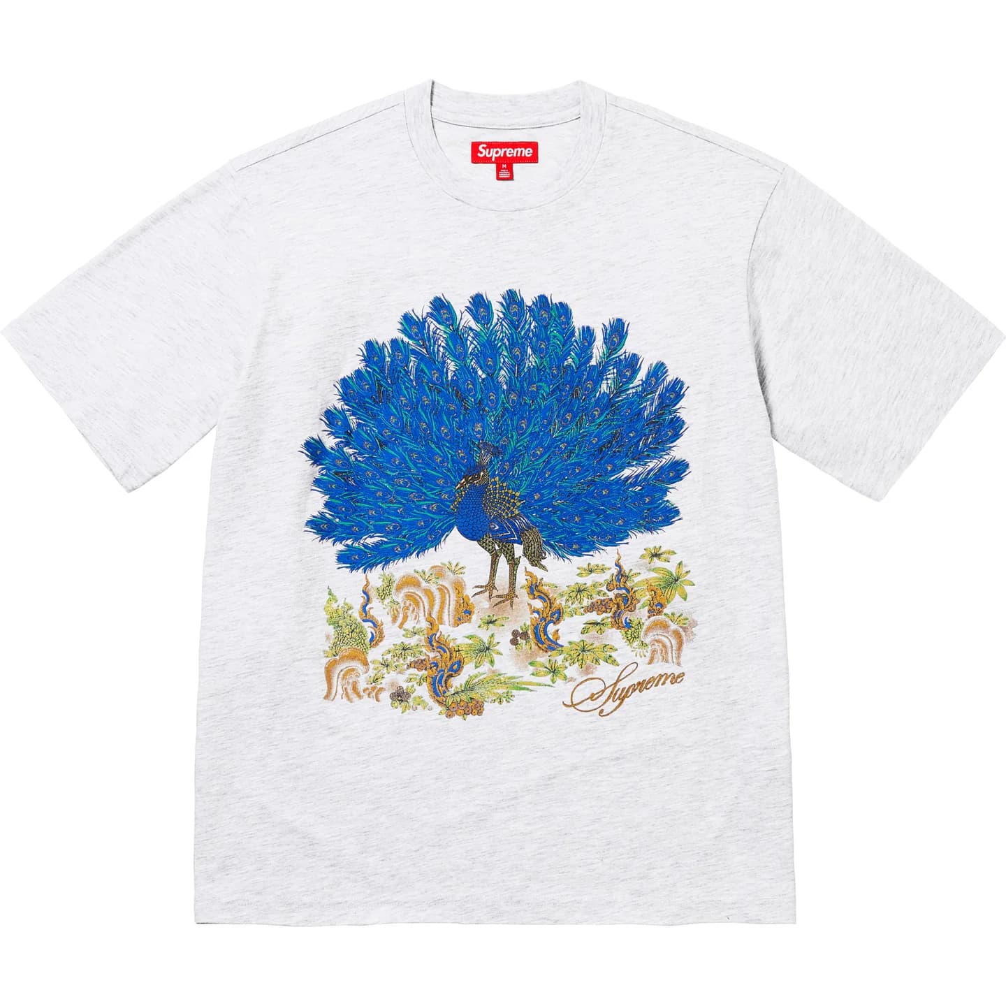 色鮮やかで緻密なタッチの孔雀のグラフィックをプリントしたコットンジャージTシャツ。
