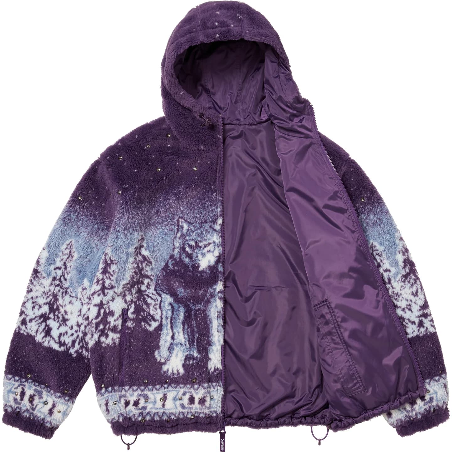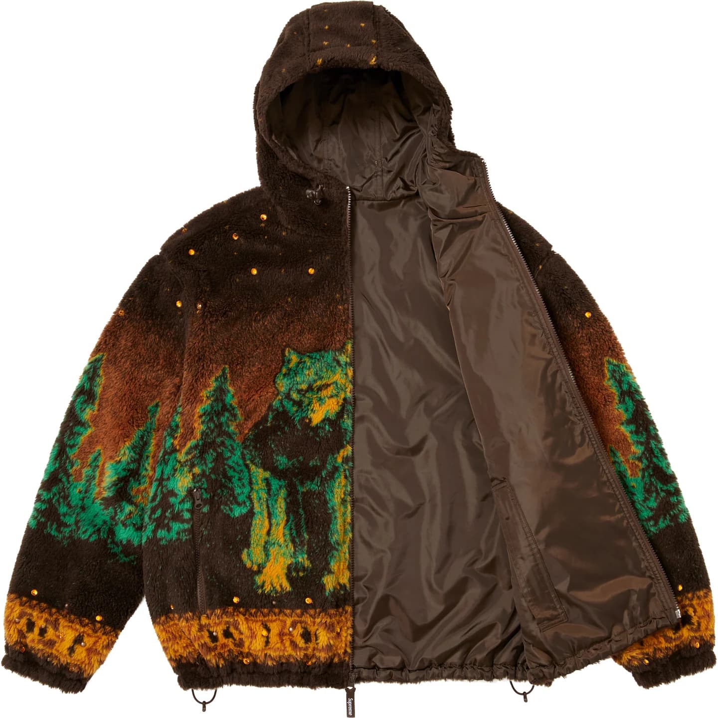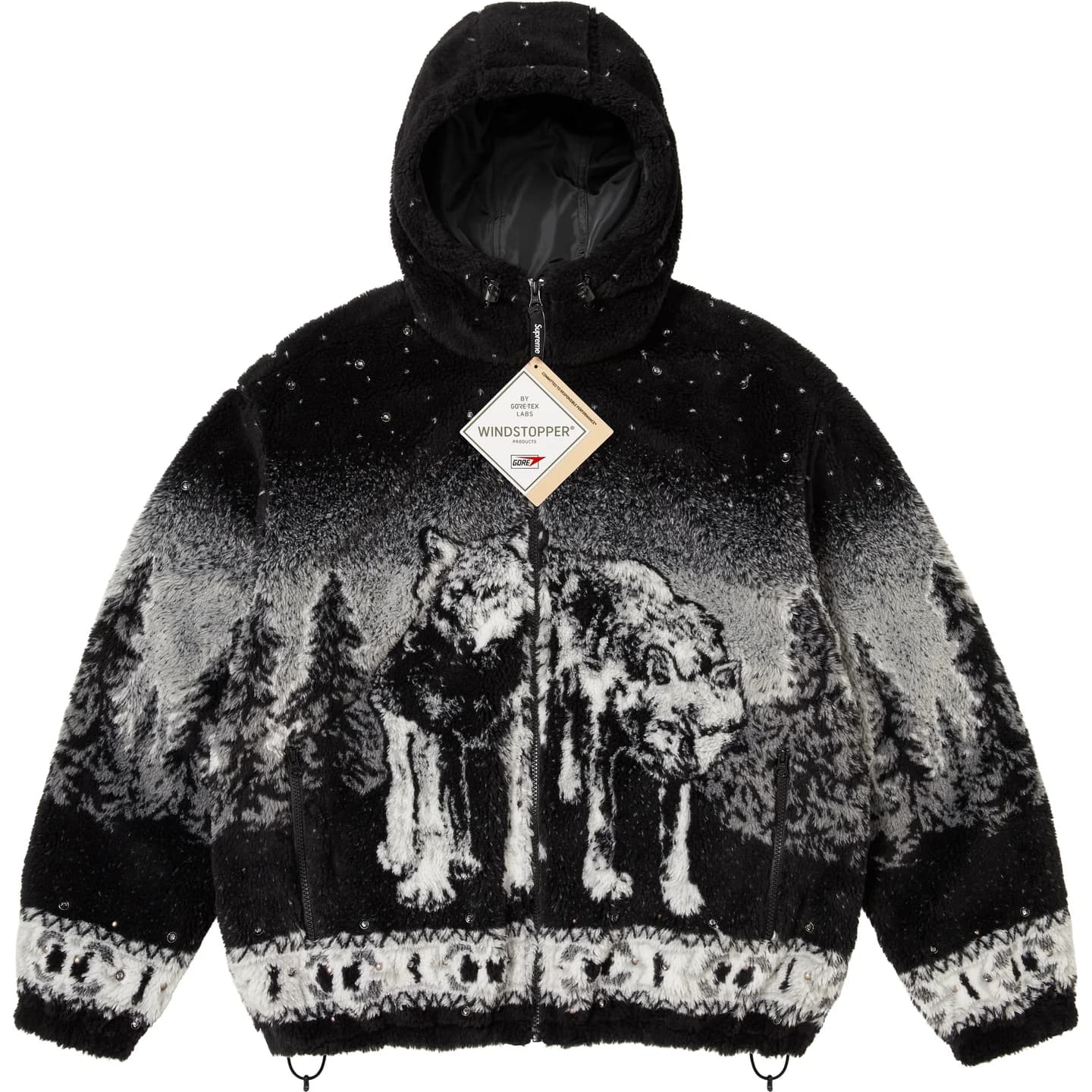 bbサイモンのメタルスタッズが夜空に浮かぶ星々を演出した、二匹の狼が印象的なリバーシブルフリースジャケット。リバースサイドはウィンドーストッパーを貼り合わせた耐水リップストップ素材のシンプルなナイロンジャケットに変更可能。