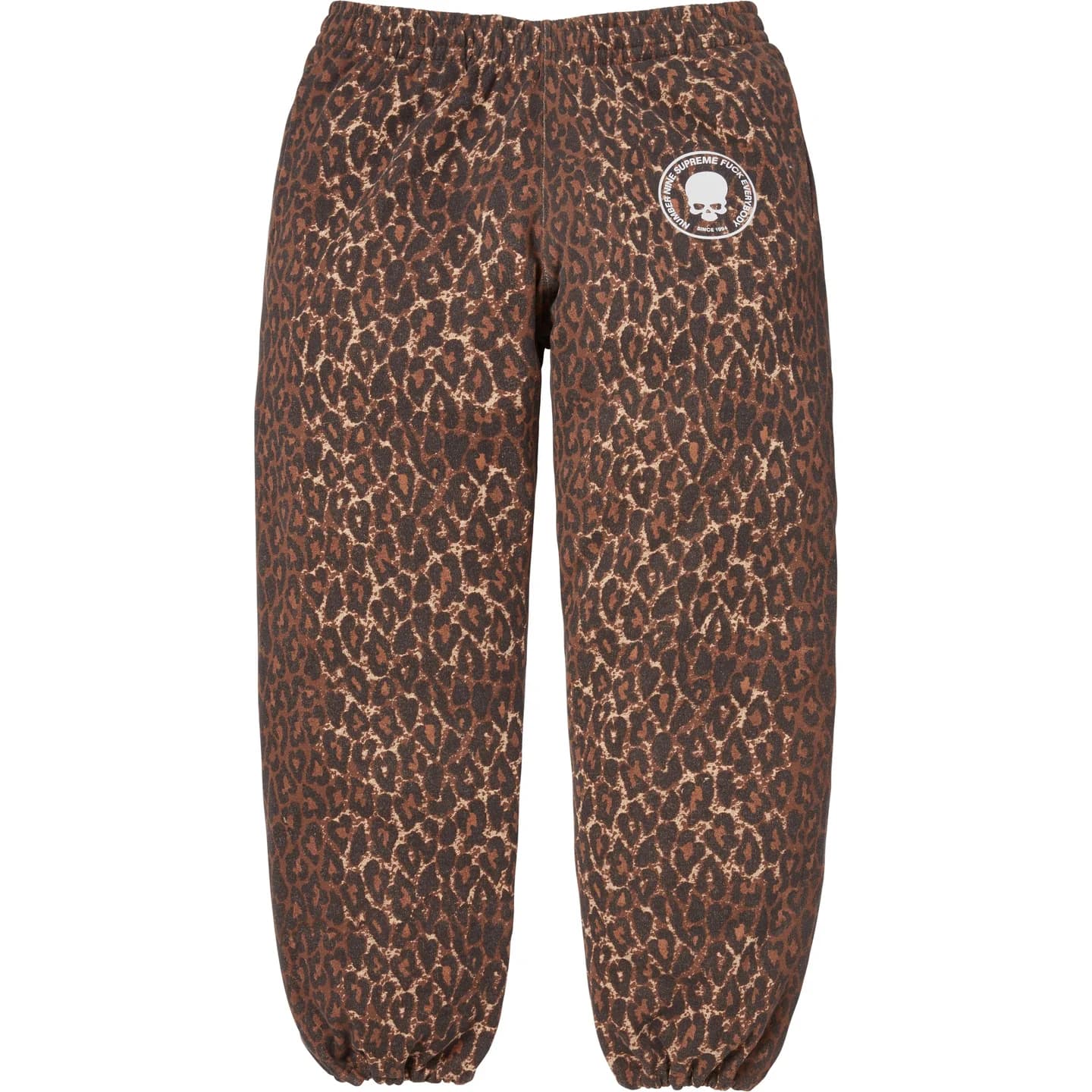 カマチョやダニエルジョンストンなど、シュプリームとナンバーナインのアーカイブアートをパッチワークでつなぎ合わせた総柄デザインのスウェットパンツ。