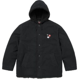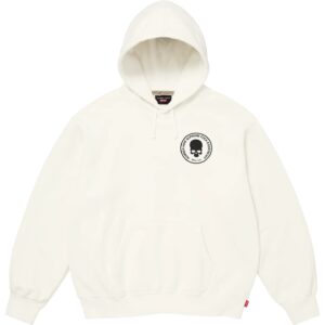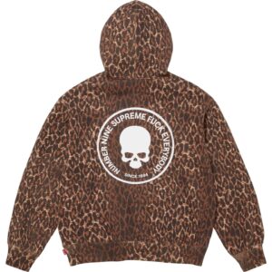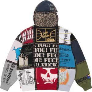 カマチョやダニエルジョンストンなど、シュプリームとナンバーナインのアーカイブアートをパッチワークでつなぎ合わせた総柄デザインのフーディ。