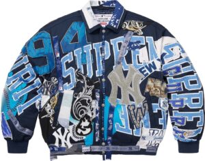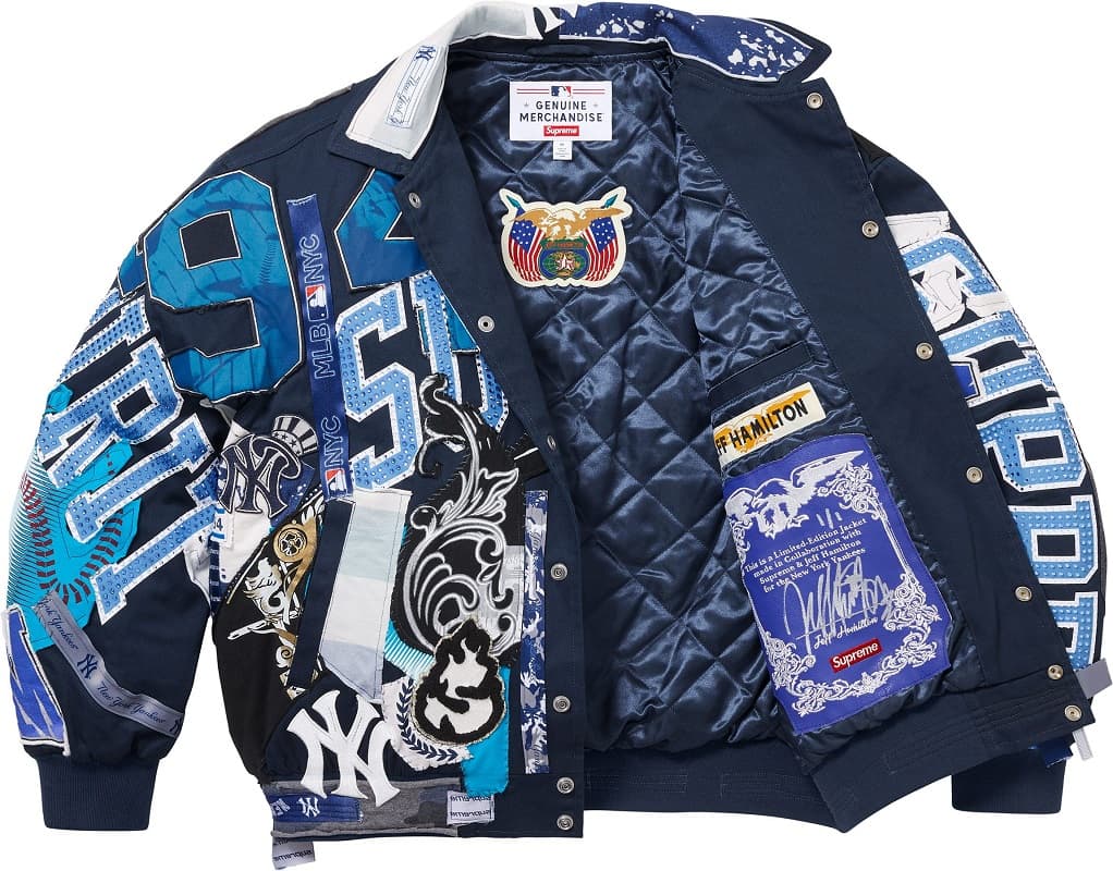 デザイナー「ジェフハミルトン」による、ラインストーンやメタルスタッズ装飾の刺繍パッチなどを豪華に施したコットンツイル素材のニューヨークヤンキースバーシティージャケット。ライナーは中綿とキルティングで保温性を高めている、メイドインUSA