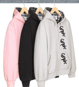 MLBシカゴホワイトソックスのチームロゴをリピートデザインした、裏地がチェック柄のジップアップフーディーとスウェットパンツのセットアップ。