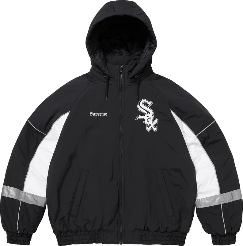 MLBのシカゴ・ホワイトソックスのチームロゴを大胆にデザインした、袖下パネル切り替えがアクセントの耐水サプレックスナイロン素材のスタジアムジャケット。内側には3Mシンサレートを封入し保温性を高めてある。