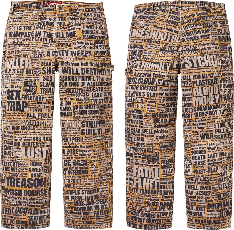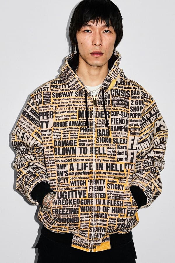 ニューヨーク出身のアーティスト「ダッシュスノー」による、コラージュアートを総柄でプリントしたコットンキャンバス素材のフード付きワークジャケットとダブルニーペインターパンツのセットアップ。ジャケット内側には3Mシンサレートを封入し保温性を高めてある。