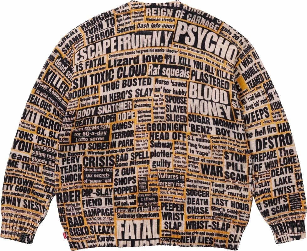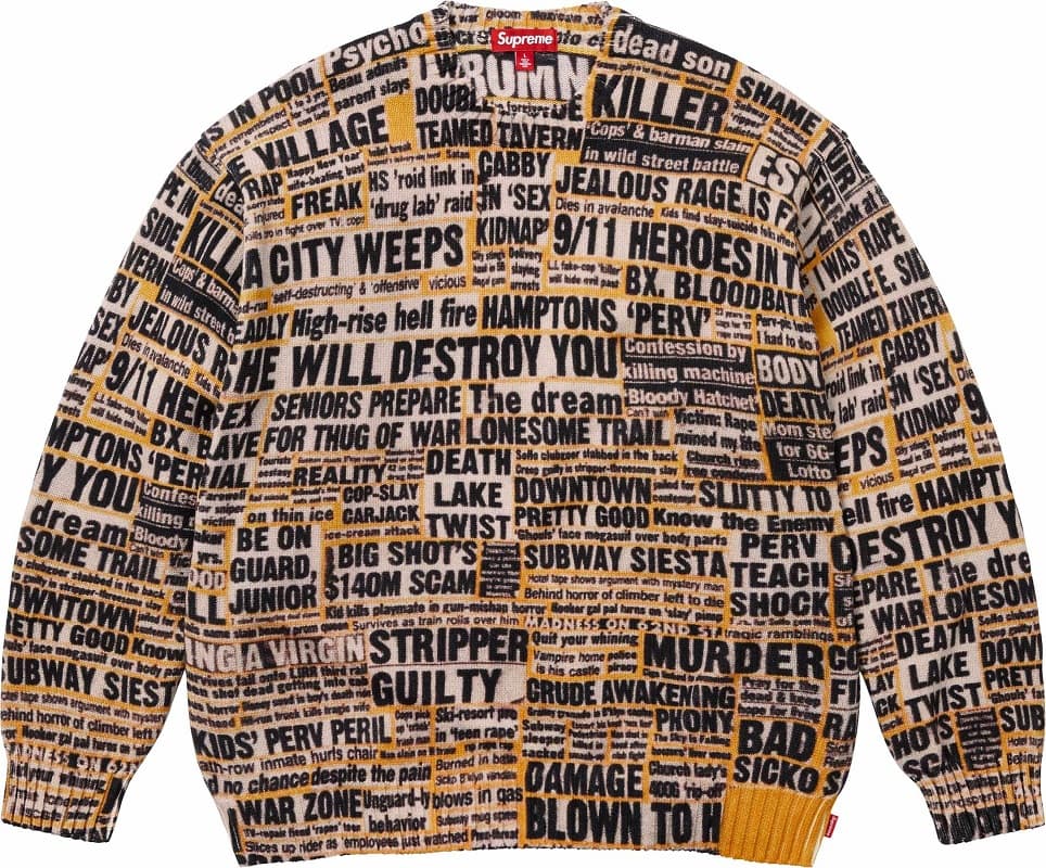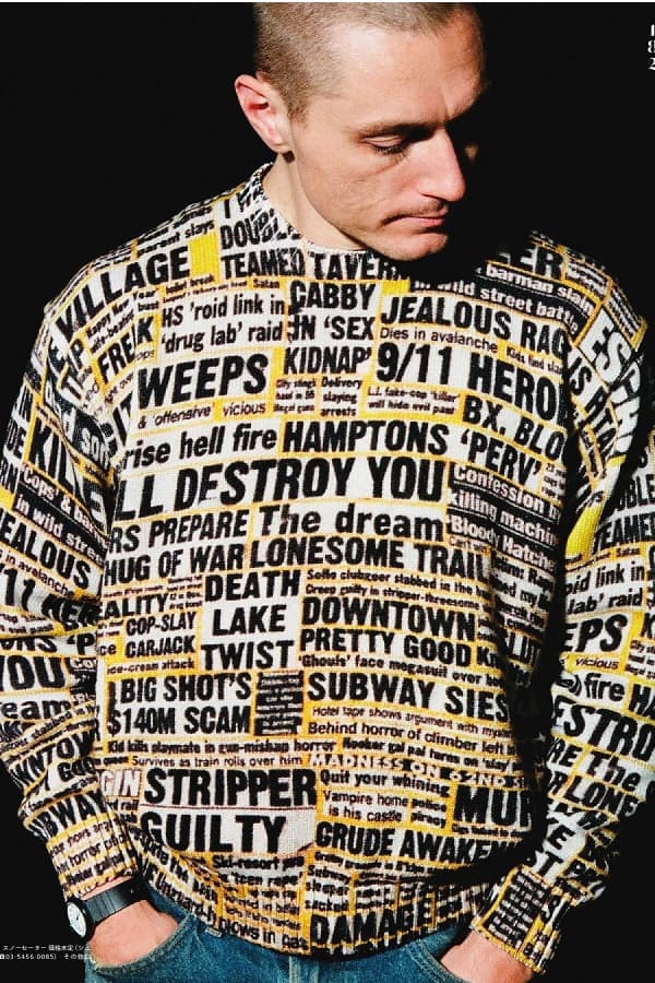 「ダッシュスノー」によるコラージュアートを編み込んだ総柄コットンセーター。