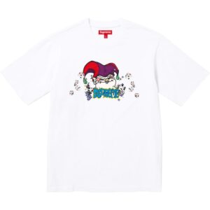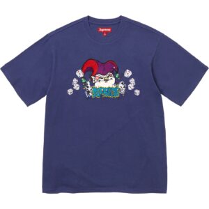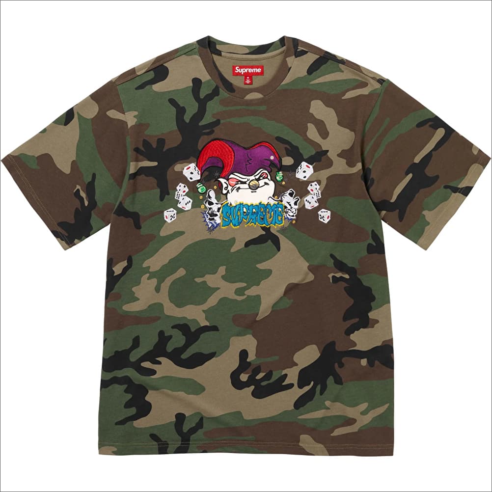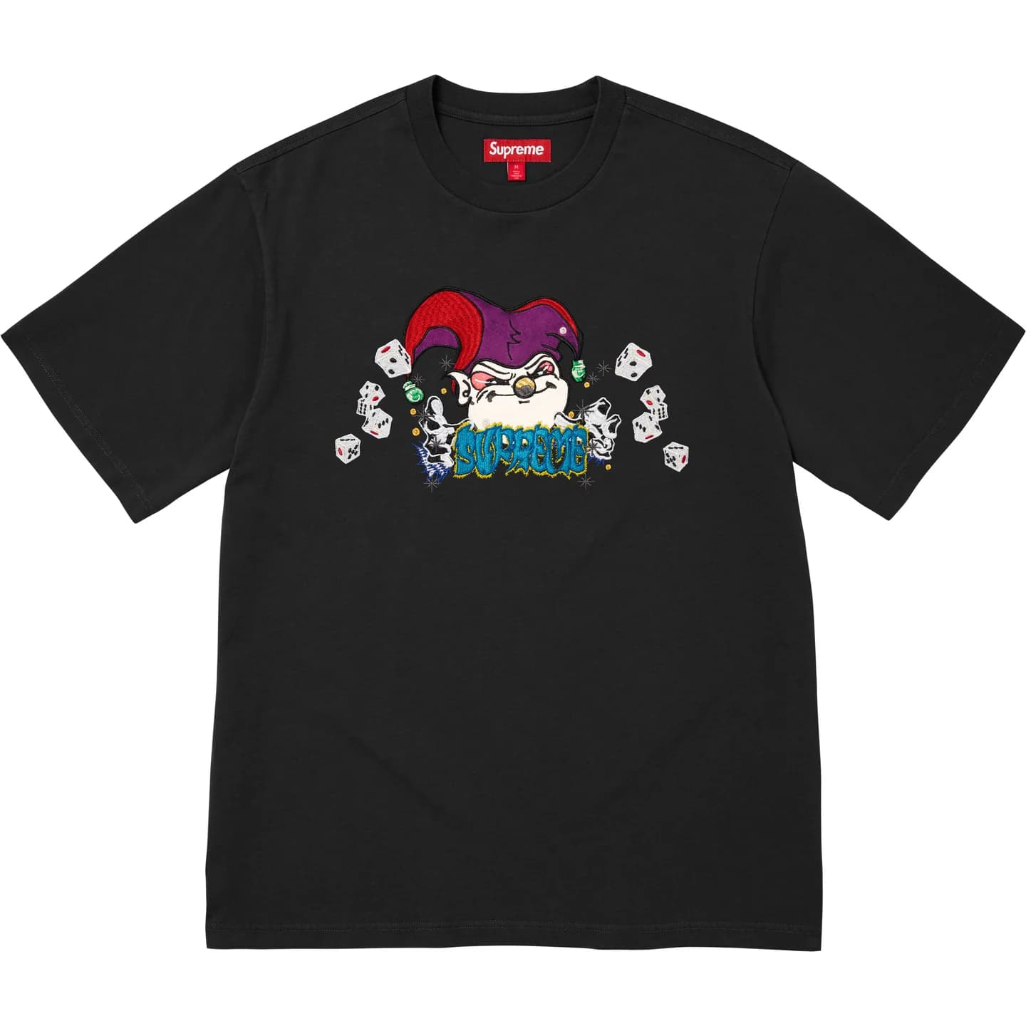 葵産業による道化師とサイコロのグラフィック刺繍がユーモラスなコットンジャージTシャツ。
