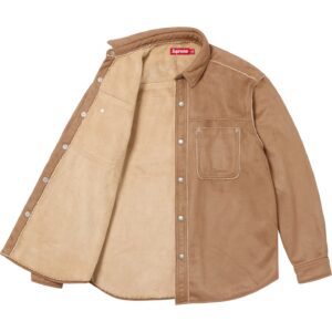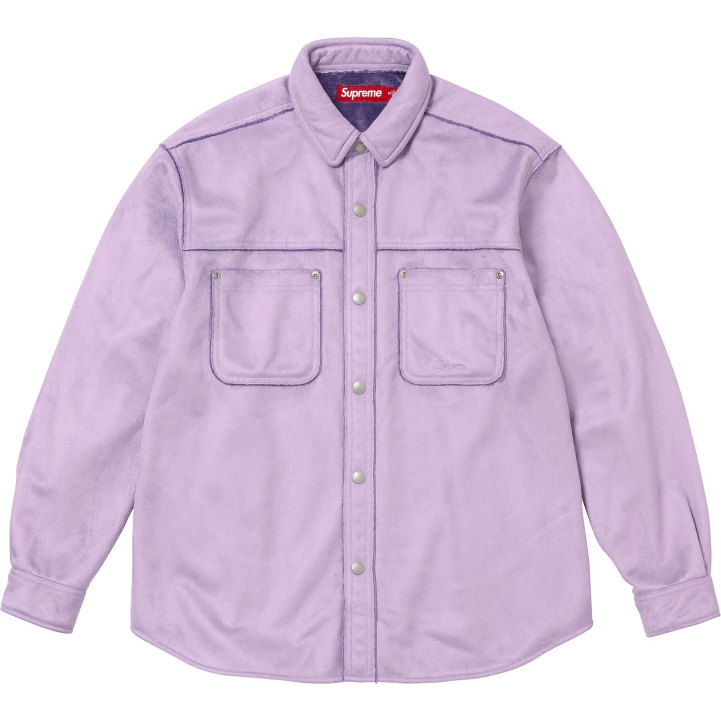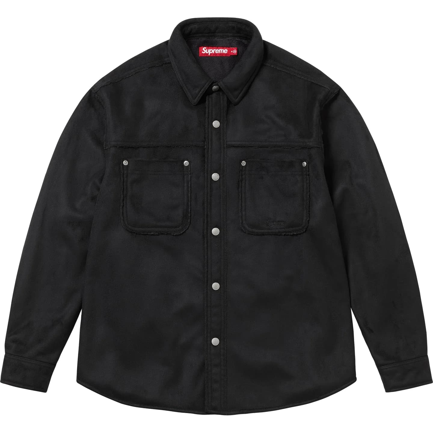 スエード風のフェイクレザー素材にポリパイルを張り合わせたスナップボタンフロントシャツ。