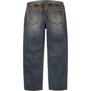 コインポケット、バックヨーク、バックポケットにレオパード柄フェイクファーを切り替えデザインした13オンスデニム素材のルーズフィットジーンズ。