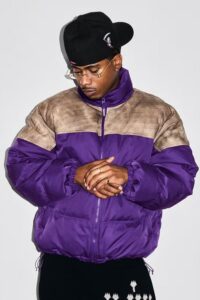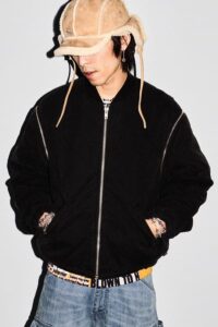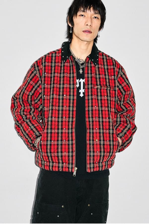1987年創業イタリアのラグジュアリーアクセサリーブランド「B.B.サイモン」による、スタッズとラインストーンで装飾したコットンキャンバス(襟はコーデュロイ素材)のキルティングワークジャケットと、セットアップのダブルニーペインターパンツ。