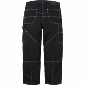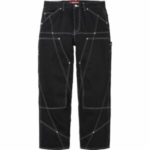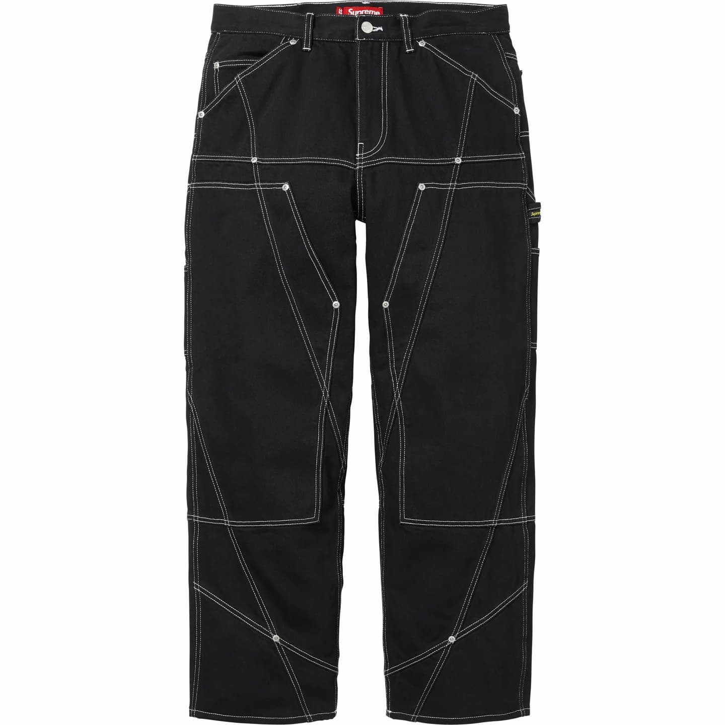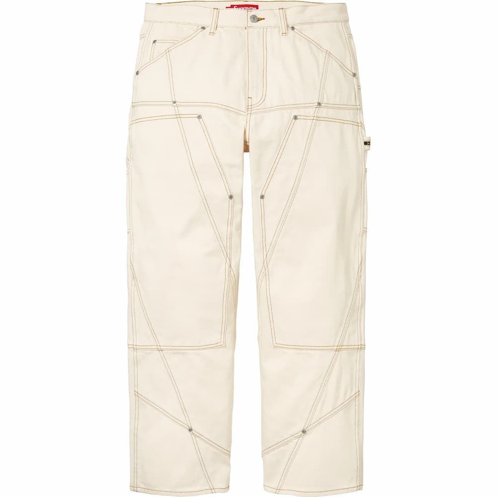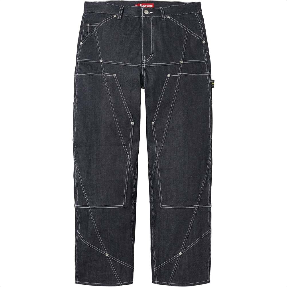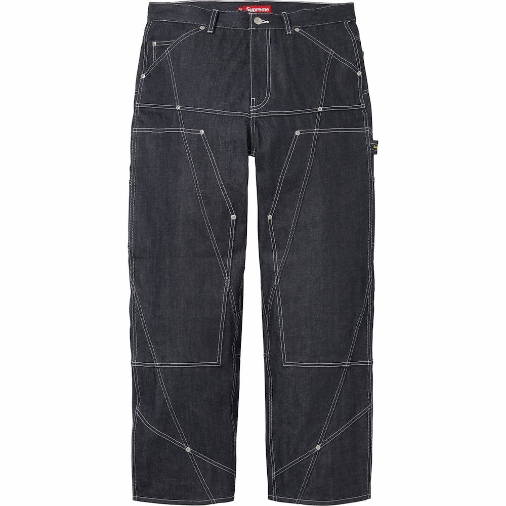 幾何学的なコントラストステッチが個性的な13オンスコットンデニムのダブルニーペインタージーンズ。