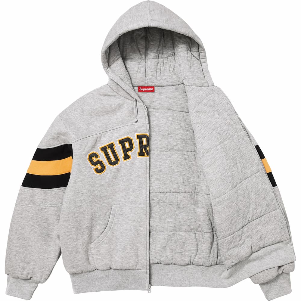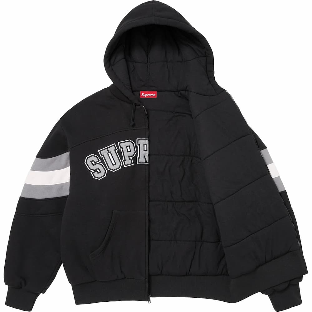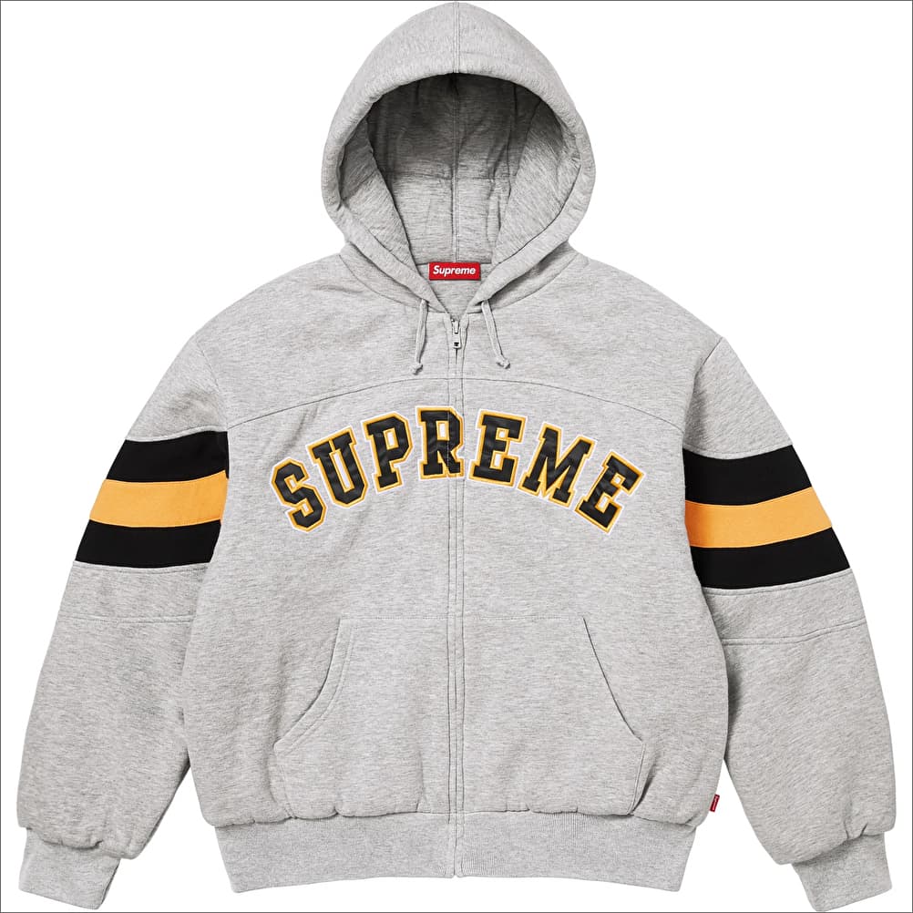 中綿を封入し保温性を高めた袖のラインがアクセントのスポーティなアーチロゴジップアップフーディ。