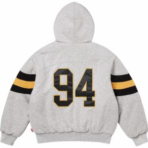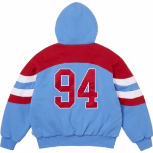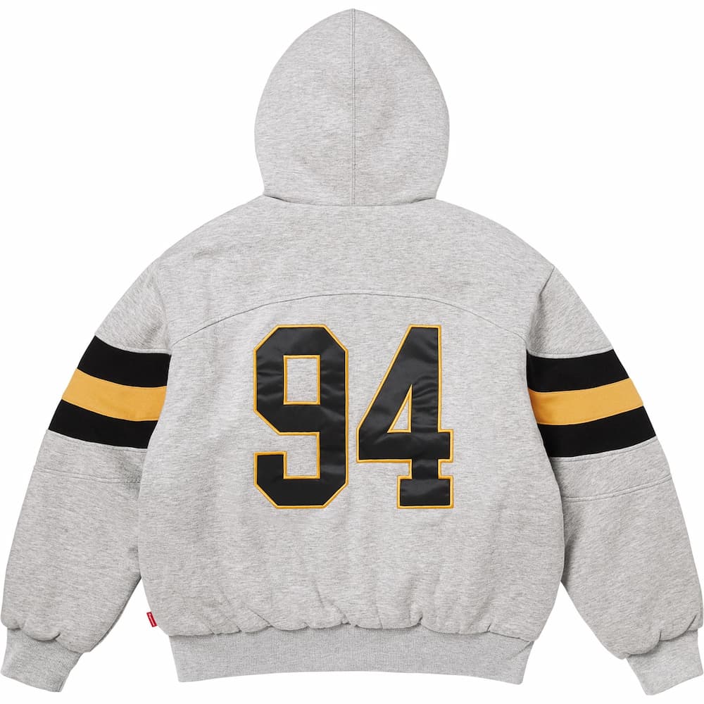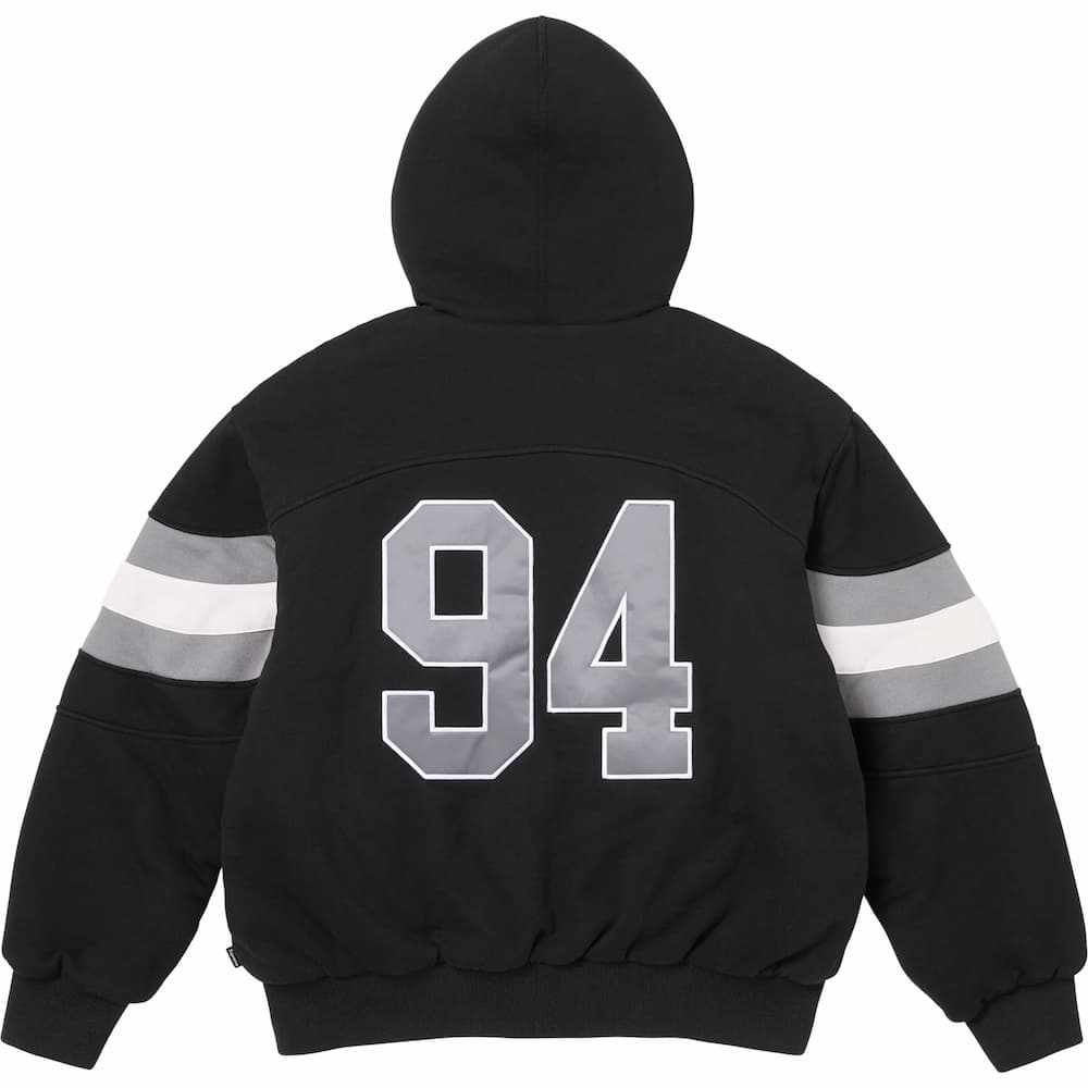 フロントの立体的なロゴパッチや袖のナンバリング刺繍でレーシングジャージ風デザインのジップアップフーディ。