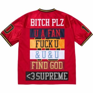 バックのナンバーを覆い隠すように大胆に施された過激なメッセージパッチが強烈なインパクトのフットボールジャージ。