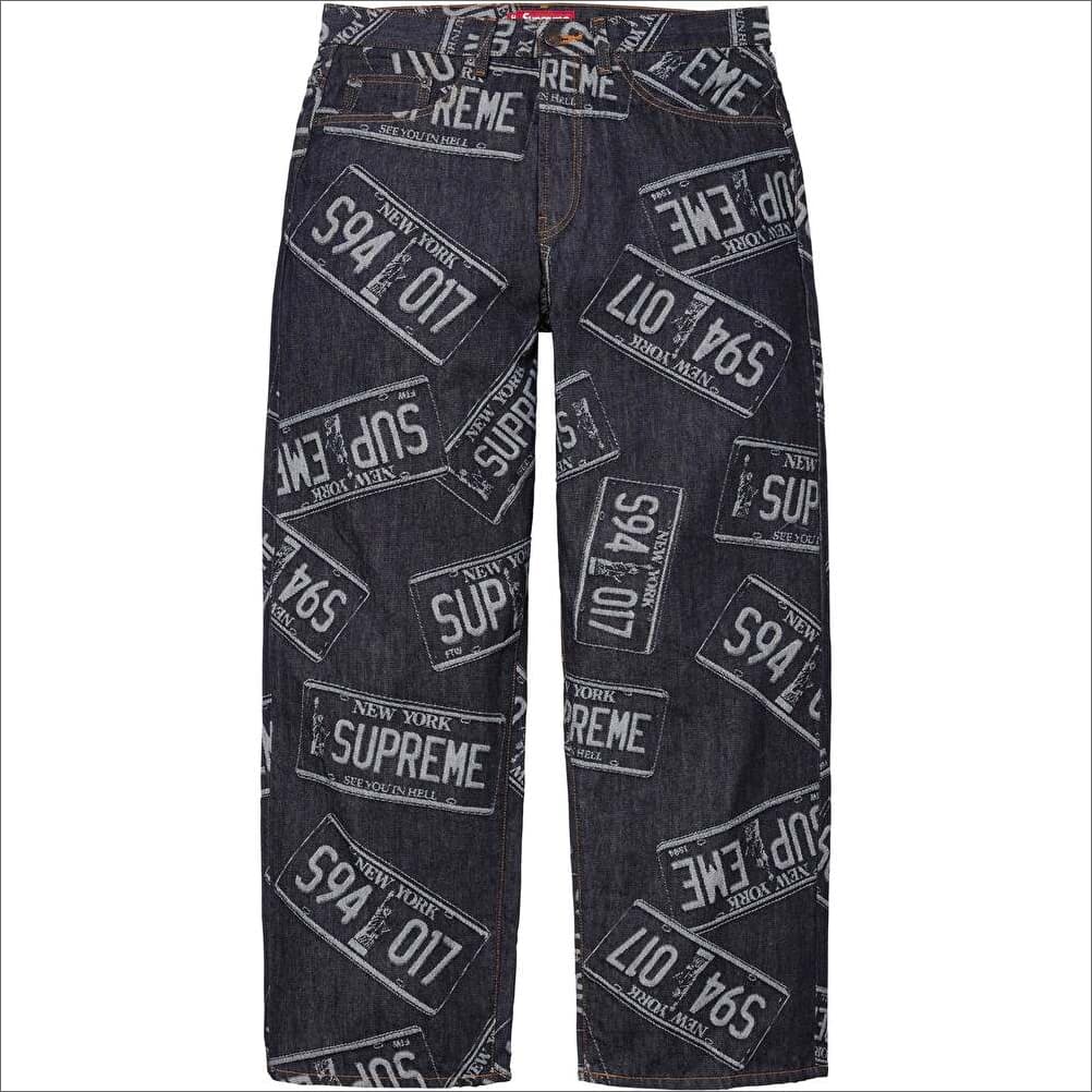 ナンバープレートを総柄で刺繍した13オンスコットンデニムバギージーンズ。