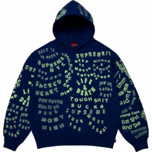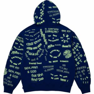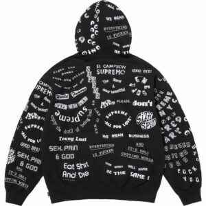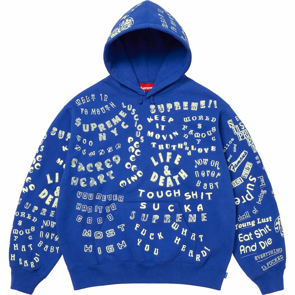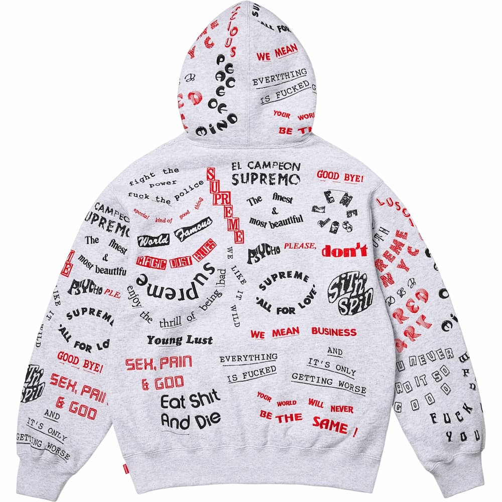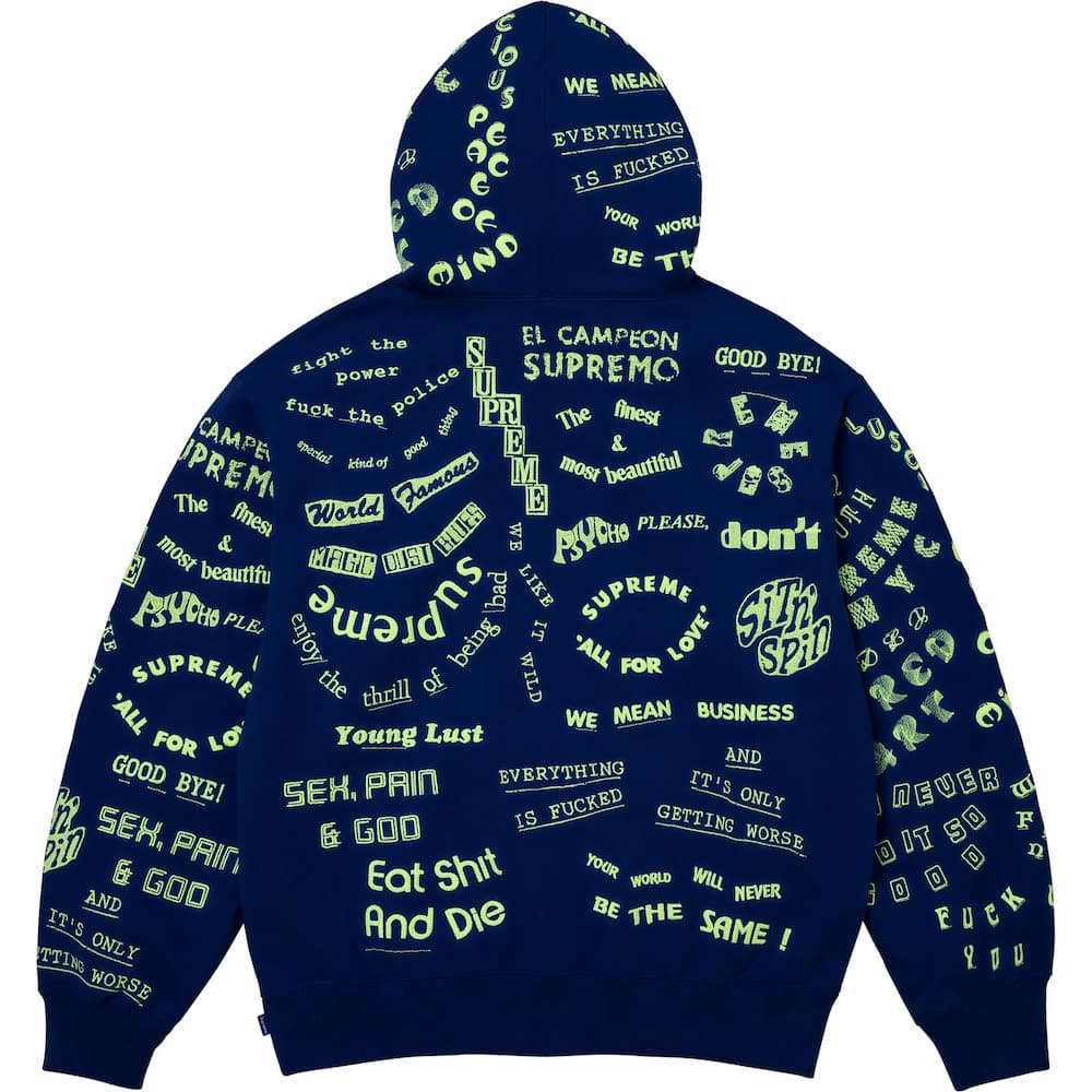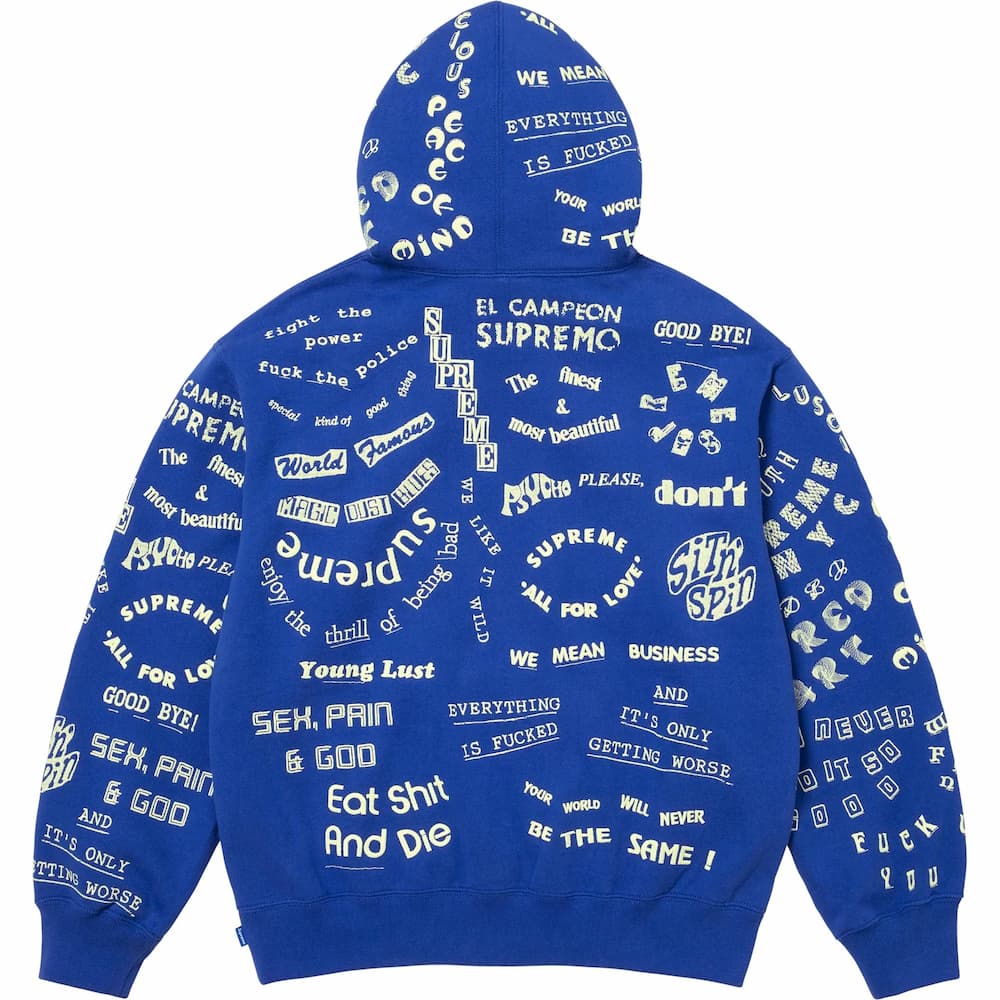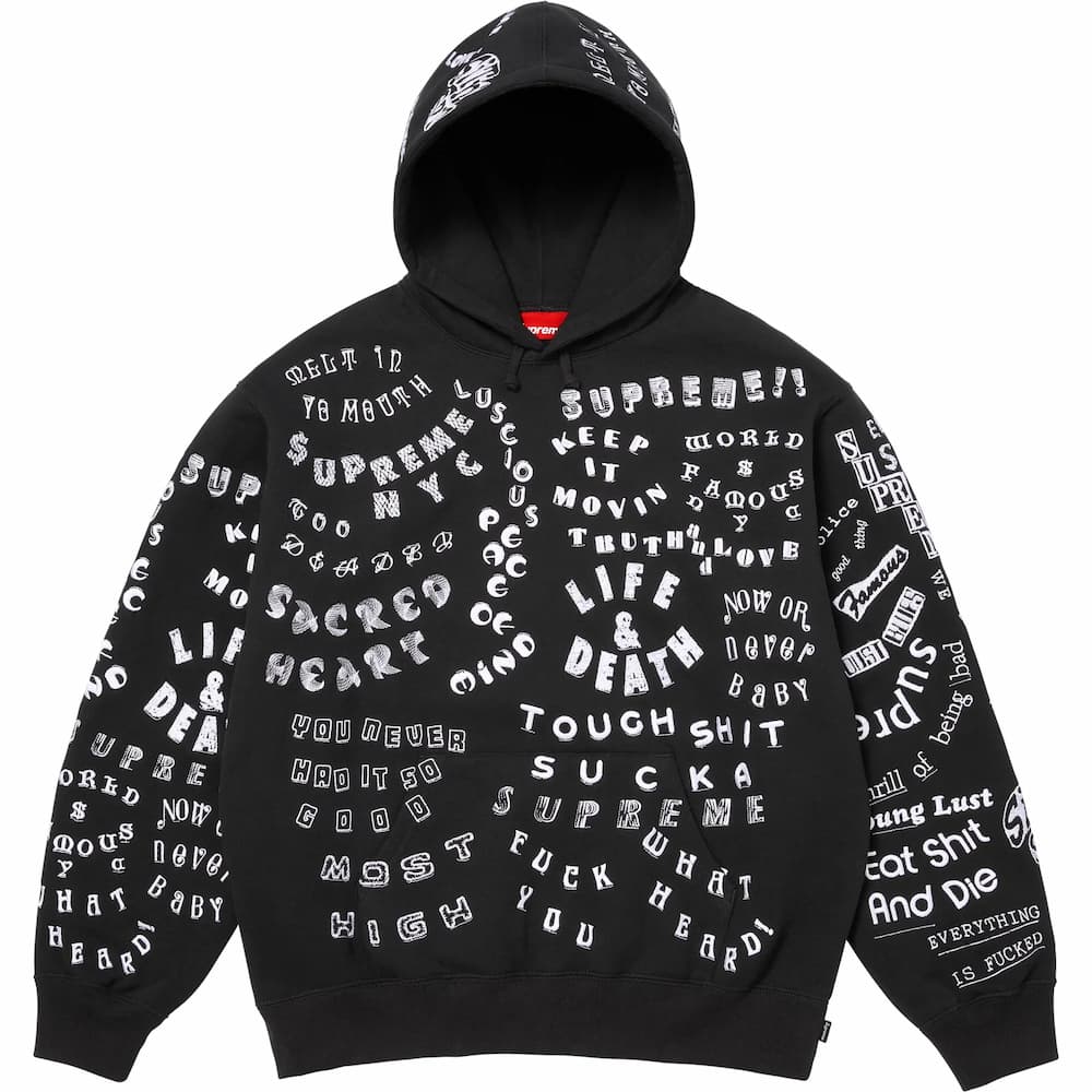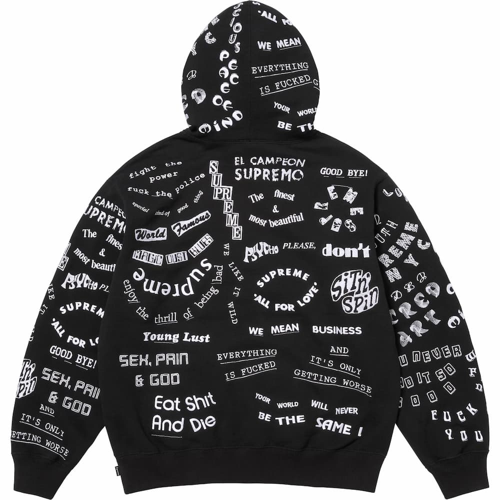 さまざまなフォントやスタイルのメッセージを総柄で刺繍したフーディ。