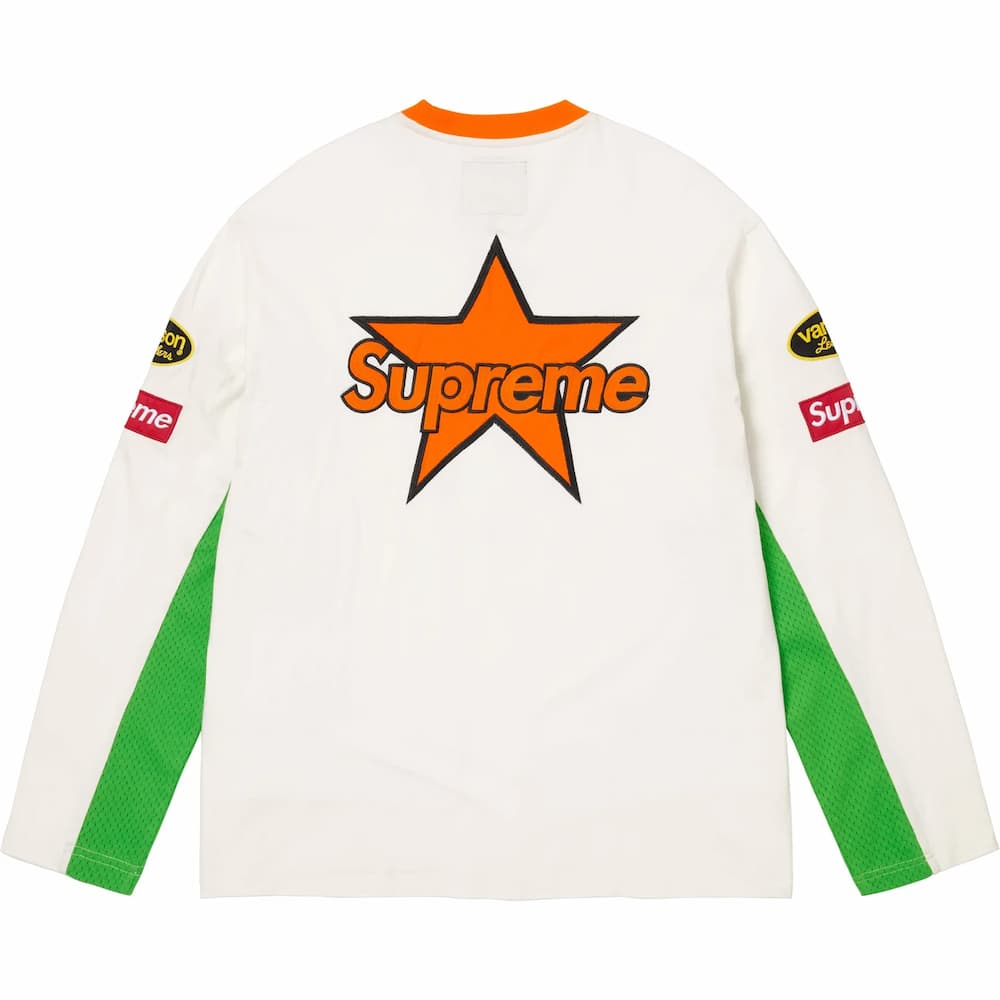 バンソン製、ロゴパッチや刺繍でモトジャージをイメージしたデザインのコットン素材のロンT。メッシュパネルで袖下からフロント部分を切り替えて通気性を高めている。