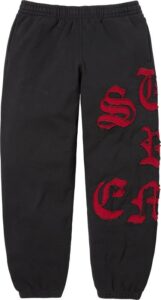 大胆にカットアウト加工したオールドイングリッシュロゴが存在感を放つジップアップフーディと、スウェットパンツのセットアップ。