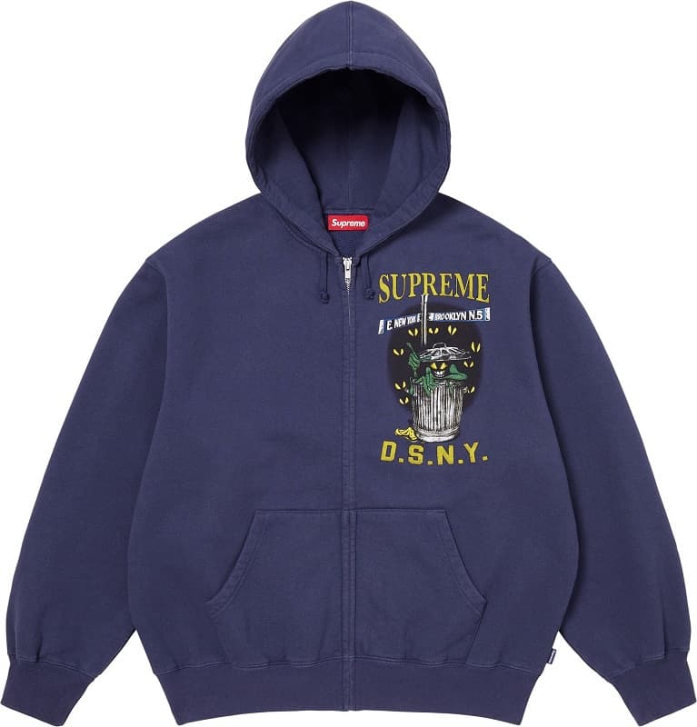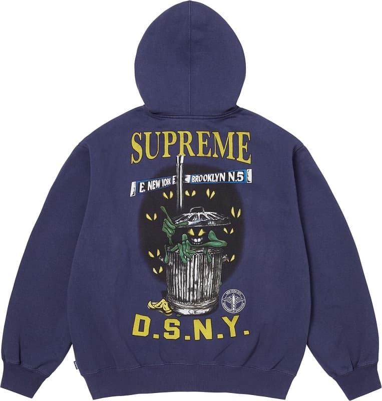 ニューヨーク市衛生局(DSNY)とのコラボレーションによる、ゴミ箱から覗く不気味なモンスターをプリントしたジップアップフーディ。